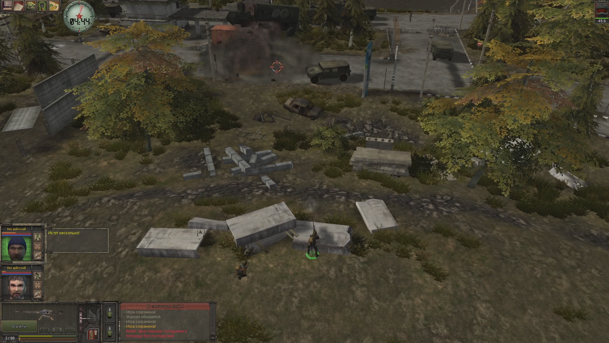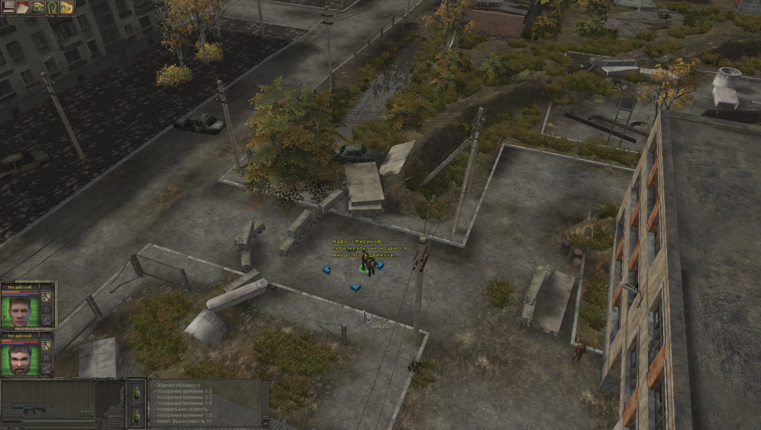Зато здесь можно зафотлочить себе игру. Герой собирается пойти на базар, чтобы узнать свежие слухи. Я решил отправиться туда за двух персонажей, чтобы продать побольше вещей. Выясняется, что откуда-то из Свердловска пришла крупная колона чвкашников. Их лидер, Жора, подбивает всех окружающих совершить налёт на химический завод, обещая участникам загранпаспорта и возможность осесть в Европе.
