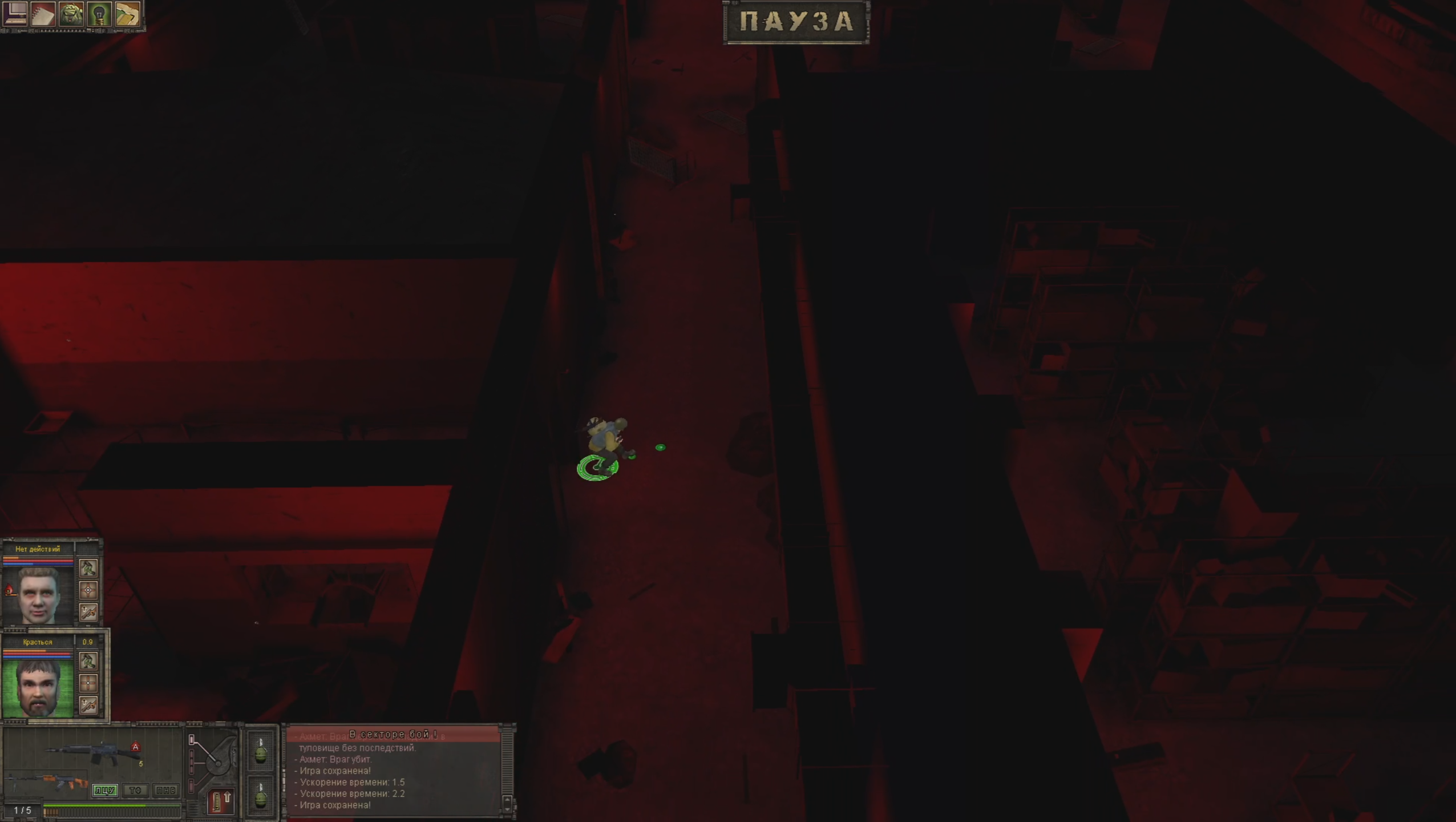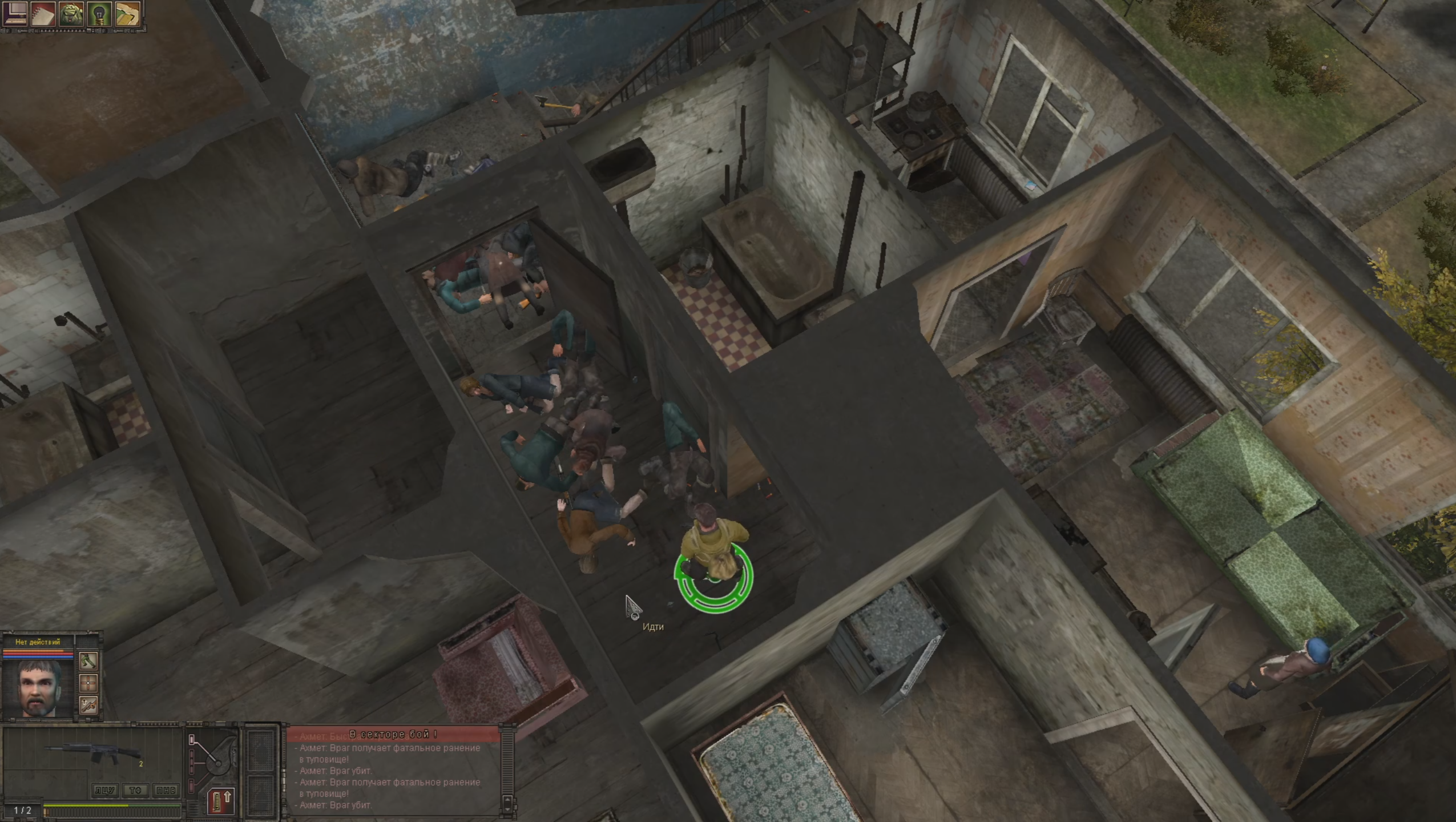Ахмет решает, что нужно переговорить с Кирюхиным. Вот только в игре есть проблема. Кирюхин отказывается говорить с Ахметов в присутствии его команды. Причём недостаточно просто убрать парней из помещения, нужно чтобы их вообще не было в локации. Однако входить и выходить с карты может только Ахмет, а отпустить члена отряда можно только у себя дома. Причём уходить герой с базара без разговора с Кирюхиным не будет. Вот и получается замкнутый круг – чтобы начать разговор нужно отпустить членов отряда, а чтобы это сделать нужно уйти домой, куда Ахмет не пойдёт, пока не начнёт разговор.