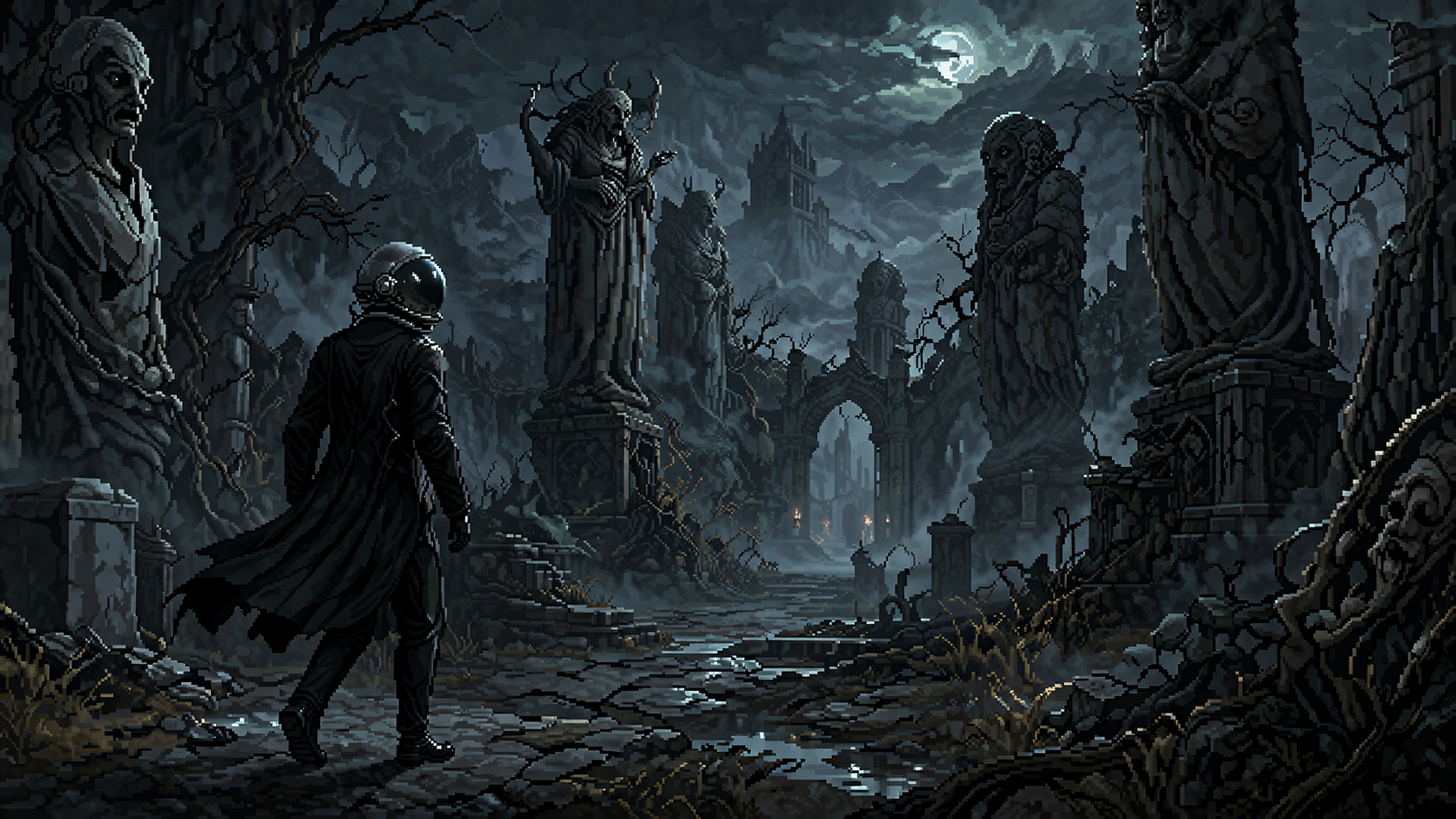 Отдельно у меня в памяти остались криповые статуи. И вот вроде бы это просто часть окружения, но именно такие штуки часто и делают мир живым — точнее, в данном случае, очень убедительно мёртвым и нездоровым.