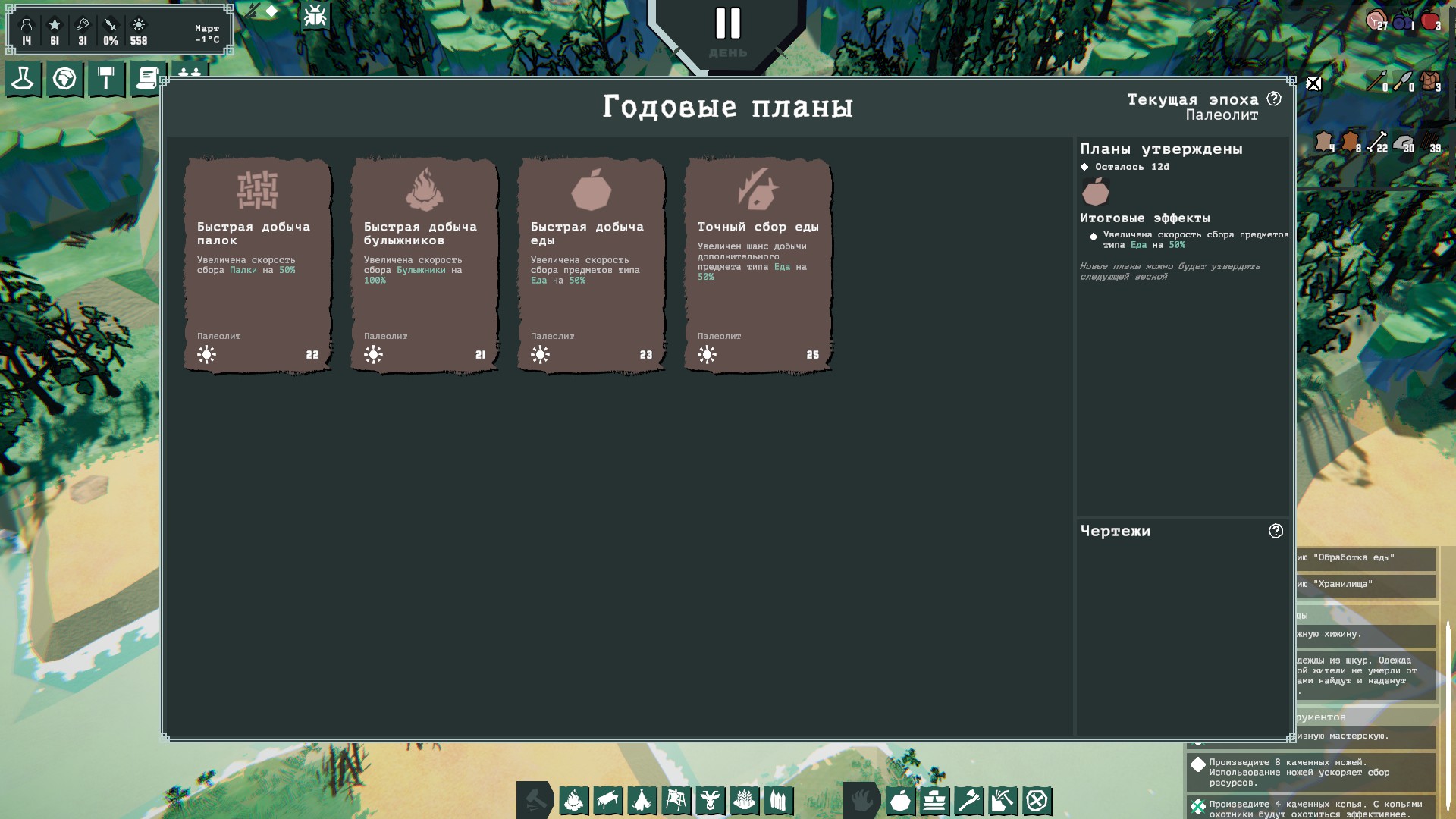 Сбор некоторых ресурсов можно задавать и вручную. Деревья, камни, палки, еда — всё это можно выделить по одному ресурсу или сразу по площади. Тогда свободные жители в какой-то момент притащат это на склады. Здесь вроде более-менее норм, собирают быстро.