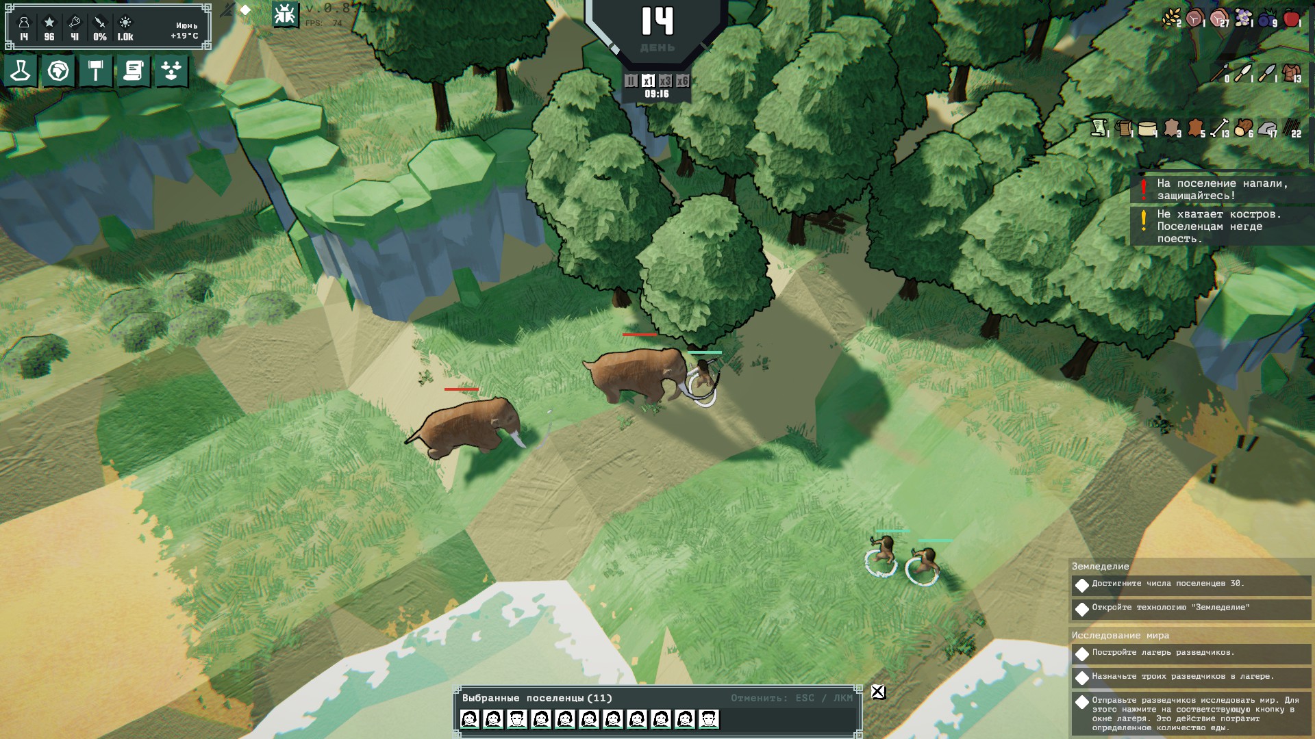 В игре существуют и угрозы. С некоторой вероятностью на поселение могут нападать враги. Ко мне пока приходил отряд волков и чиканутые злые мамонты.