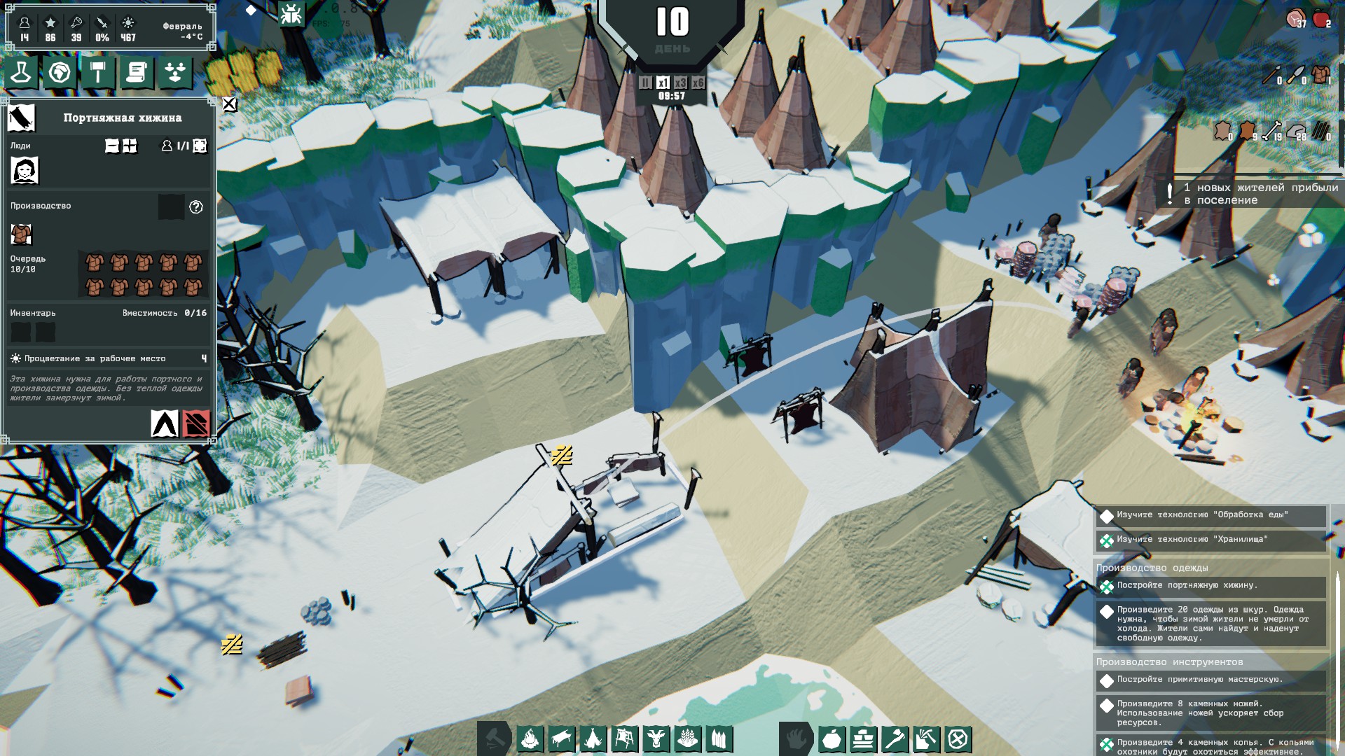 Обязательно нужны дома. Обязательно надо прокачать создание одежды к зиме (7-8 игровой день), да и саму одежонку понаделать на всех. У меня, например, портняжная хижина с первым снегом ещё не появилась.