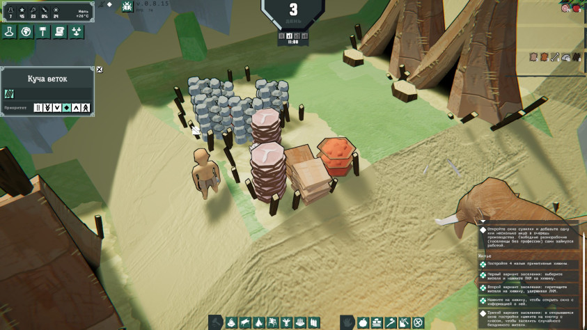 Взаимодействие с юнитами немного мудрёное. В некоторых случаях их можно прямо выделить и отдать им прямой приказ. А иногда — нет. Ряд действий человечки выполняют сами, а игрок может только повысить или понизить приоритет.
