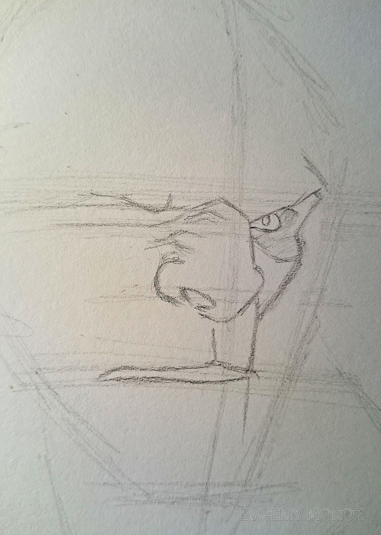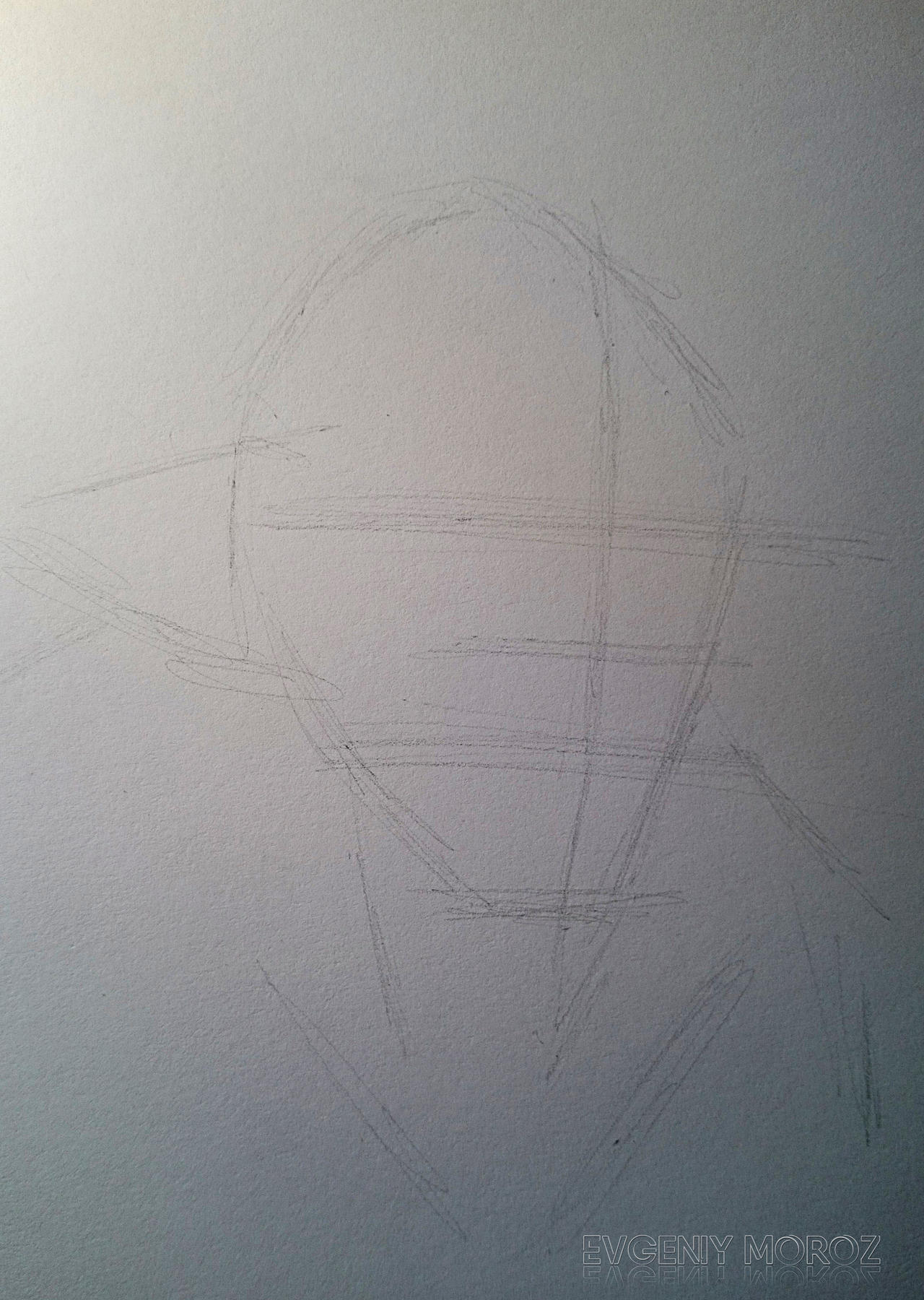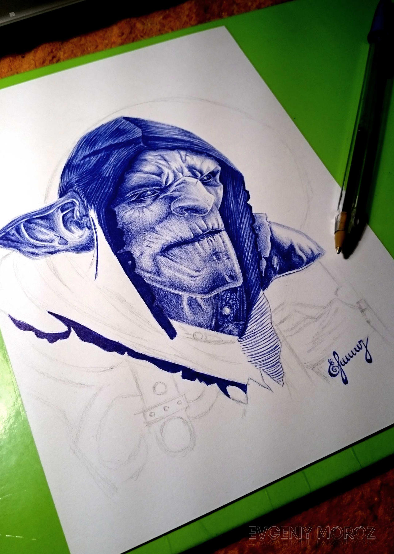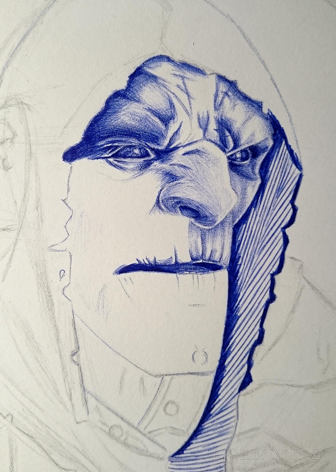 Использовал: чертёжный лист (формат А5), механический карандаш с грифелем 2В, синюю шариковую ручку Bic Cristal.