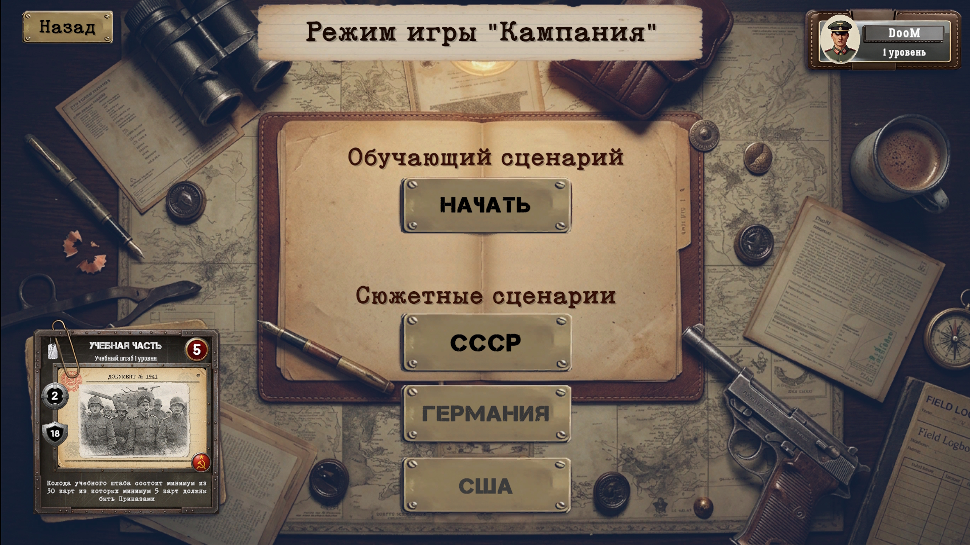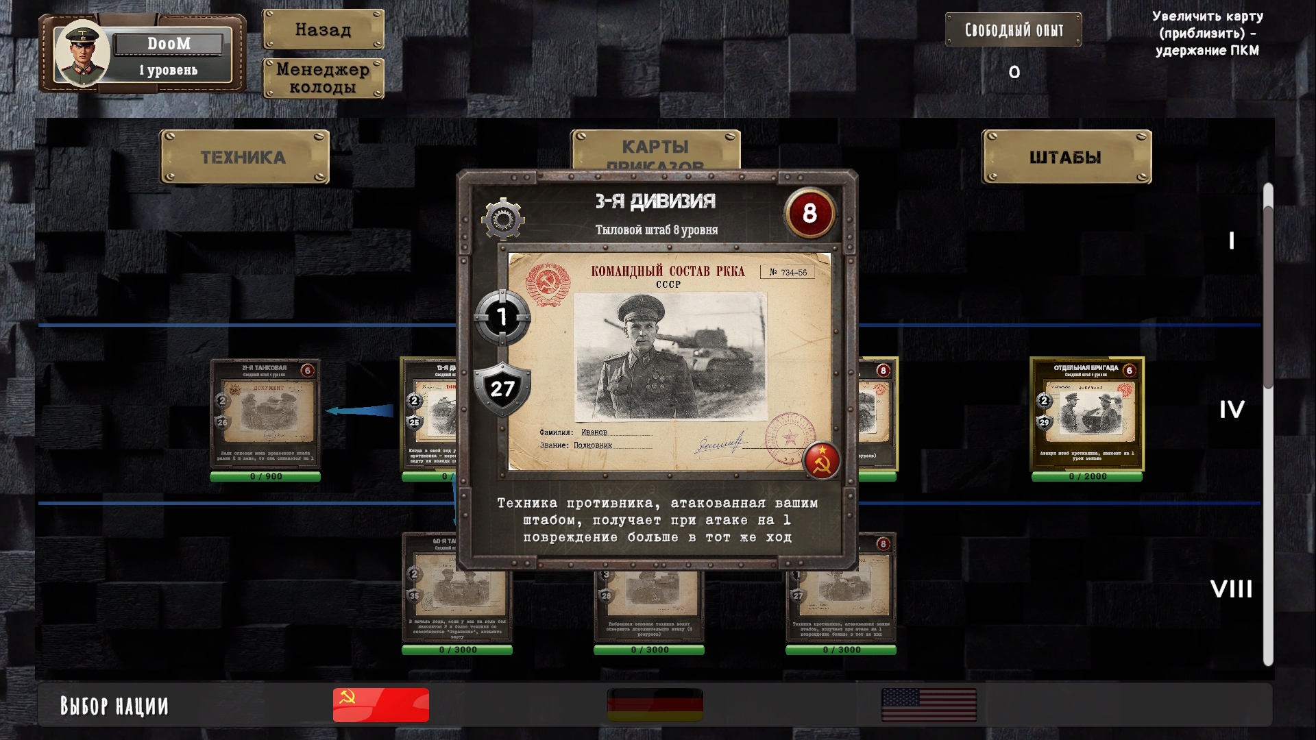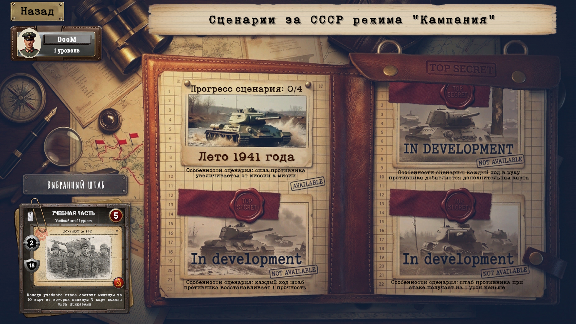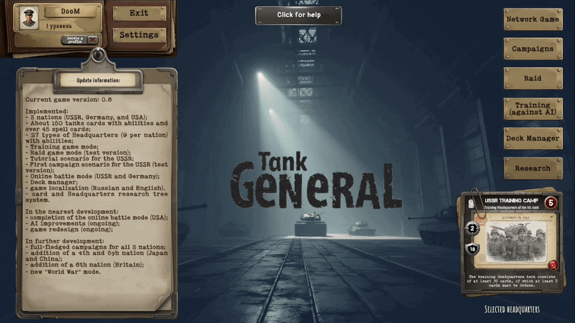 Разрабатываемая мной игра уже имеет вполне рабочий билд. В нём реализованы около 200 карт техники и приказов, три играбельные нации, около 30 штабов со способностями, несколько PvE-режимов, а также сетевой режим, который является основным в моей игре.