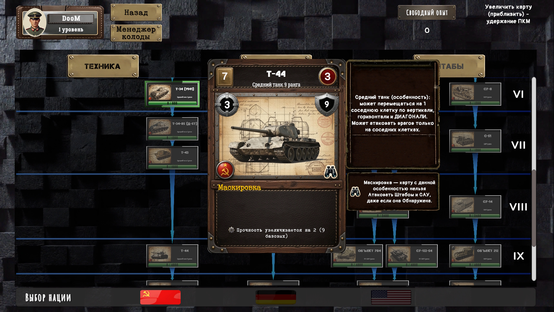 В моём случае я взял отличные механики из закрытой, но очень хорошей игры и добавил к игре возможность исследования карт танков, карт заклинаний и штабов, как в наших танковых играх. На мой взгляд, это очень удачная идея. Я очень не люблю элемент рандома в большинстве карточных игр, когда ты открываешь кейсы в надежде вытащить нужную карту. Я же планирую всё сделать открыто и без элемента рандома: хочешь получить конкретную карту — выбирай путь и исследуй её. Не нравится — можешь отложить или вообще не исследовать.