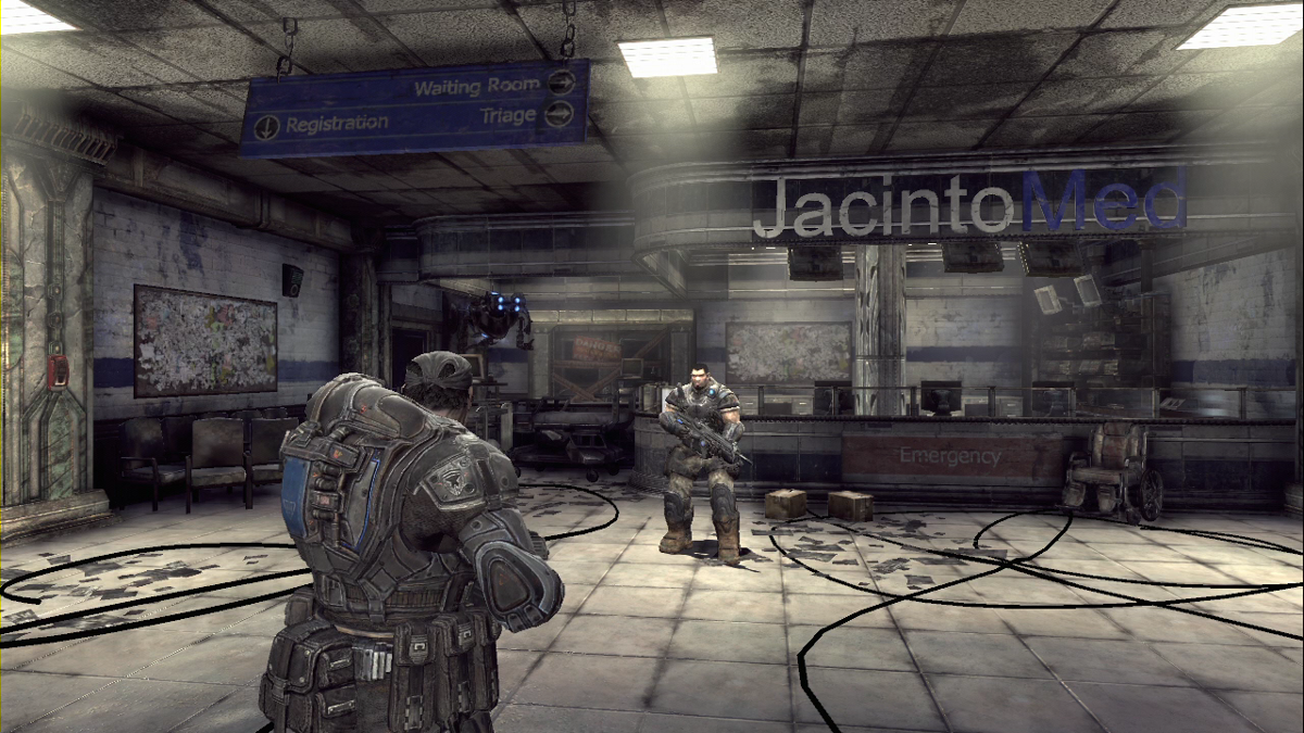 Наследие Unreal начало ослабевать и в сегменте сюжета, уступая место более внятному сценарию и истории, которая не боится напустить драмы. Нет-нет! Мы все еще играем в тестостероновое мочилово с квадратными мужиками, только теперь разработчики додумались не экранизировать описание с задней стороны коробки для диска, а сделать приключение более осмысленным и…пробирающим. Опять же — скорее всего тут постарался Modern Warfare, который не стеснялся показывать некоторую грязь и откровенно жуткие моменты войны: Маркус часто натыкается на саркофаги с заживо заколоченными людьми, видит, как некоторые солдаты в бою получают жуткие увечья, а одного и вовсе сжирают паразиты прямо на глазах у всего отряда. А Доминик, самый добродушный член отряда, начинает искать свою пропавшую жену во всем этом хаосе, все глубже погружаясь в злость и меланхолию. Некоторым персонажам наконец-то дали хоть немного объема, что игре пошло только на пользу. А некоторые моменты если и не вызовут ком в горле, то точно сильно тронут.