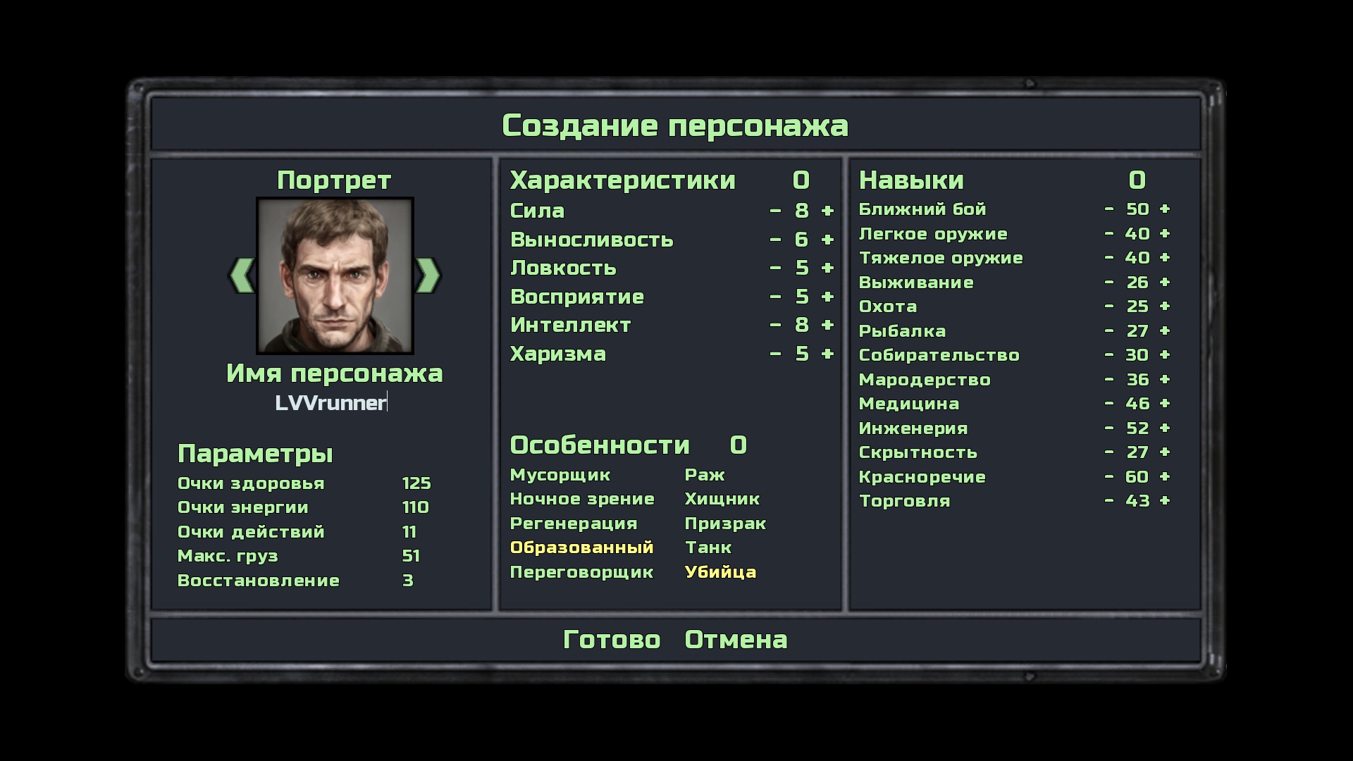 Игра начинается с создания персонажа. Процесс сразу показывает серьёзную ролевую систему. Каждый стат кардинально будет влиять на стиль игры. Очень важны пассивные особенности, они все улучшающие. Масса навыков. И про всё можно почитать в удобных всплывающих меню.