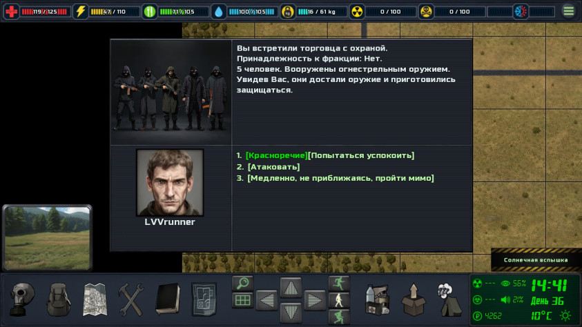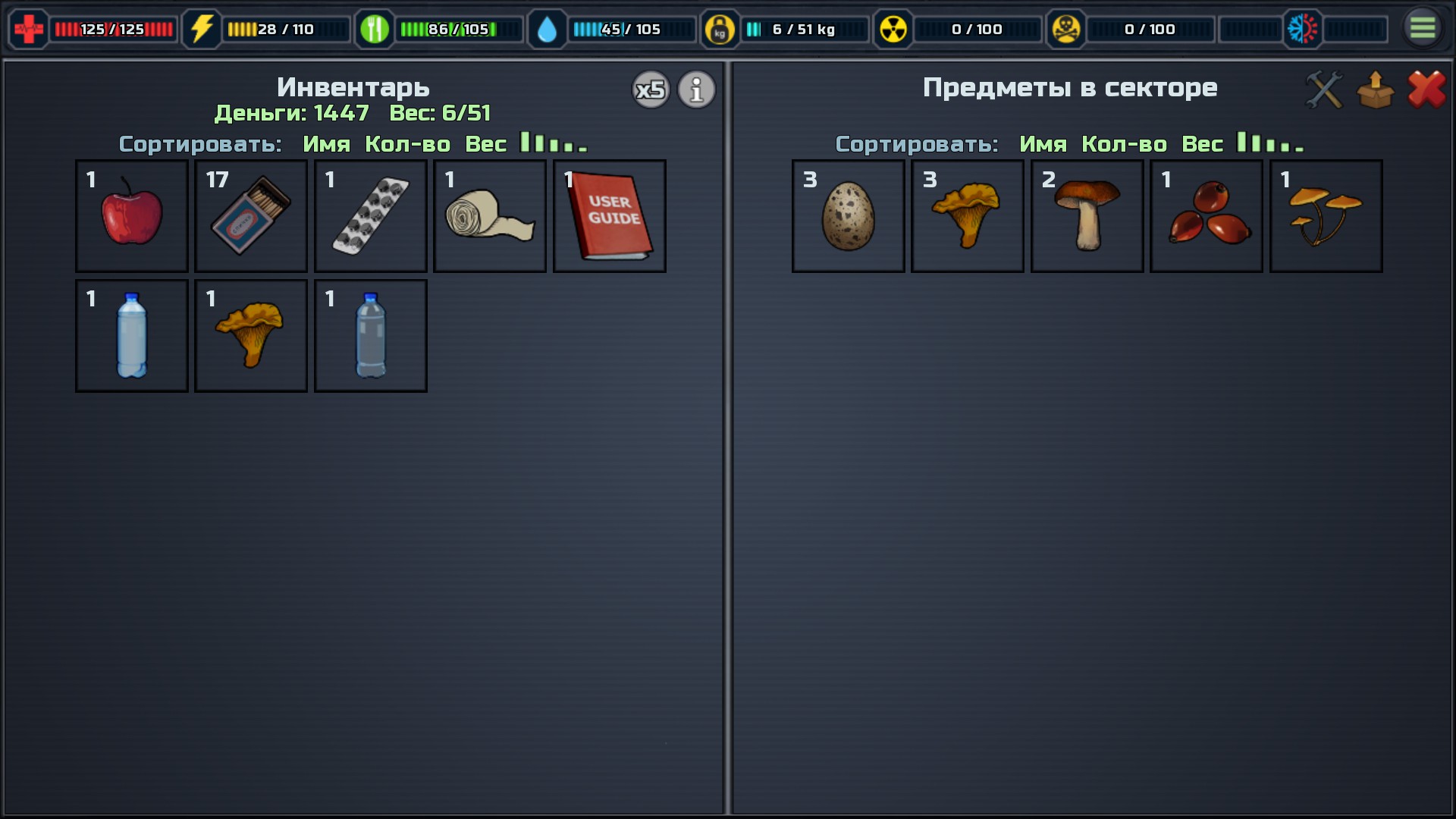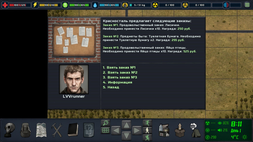 Изначально наш персонаж довольно-таки нулевой. В том смысле, что даже нет какой-то палки в качестве оружия. На несколько игровых дней пожрать есть, да и всё. Ситуация печальная. Поэтому особенно геройствовать не стоит.