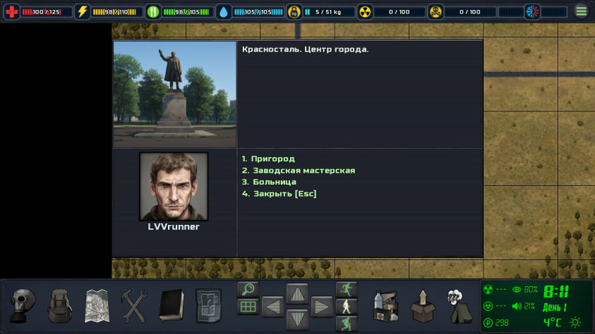 Герой начинает в городке под названием Красносталь. Первым делом рекомендую посетить КПП. Там надоумят ходить на местную работку, которая и даст ресурсы для стабильного выживания и прокачки.