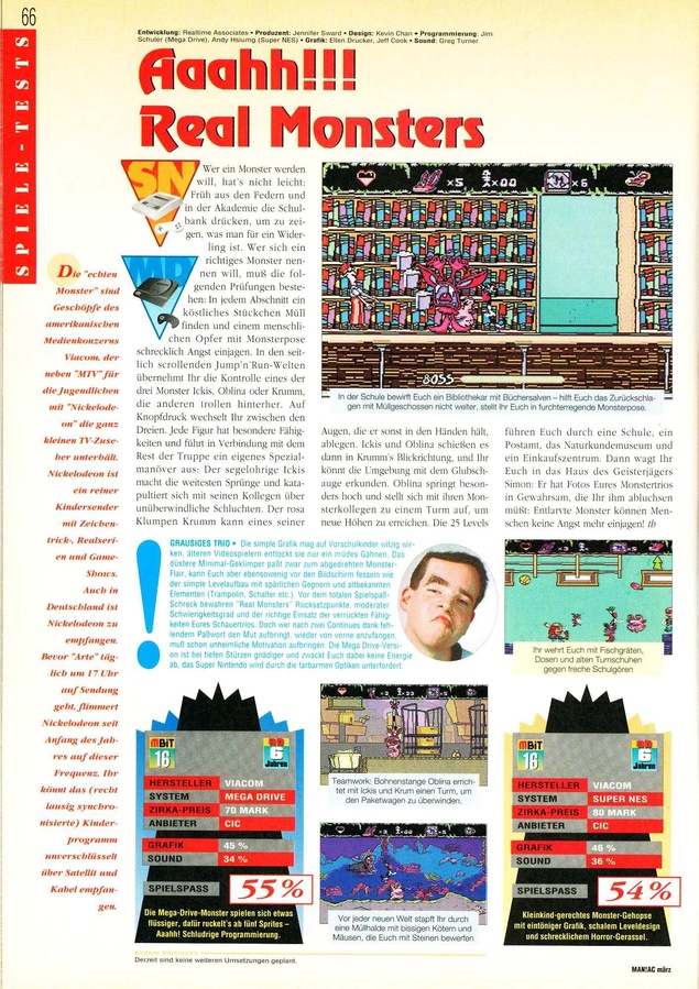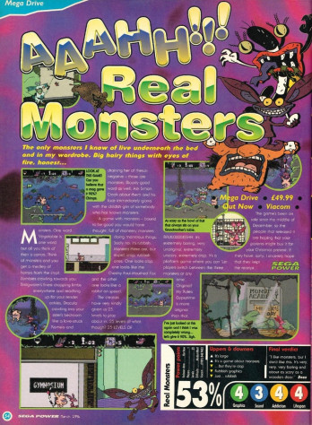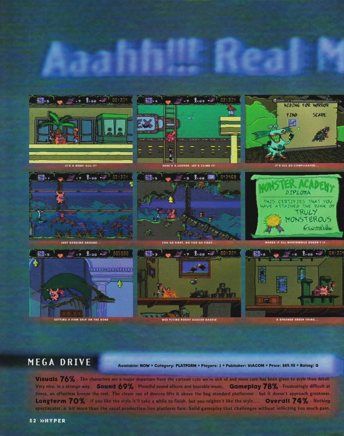 И вот нужно ли советовать Aaahh!!! Real Monsters? Да и кому? Фанаты сериала порадуются атмосфере начальных уровней, да музыкального сопровождения. Любители бродилок добавят ещё один пункт игрового опыта. Но проходить полностью, да ещё и без упрощающих жизнь возможностей эмуляторов…ну, я б не смог. А если бы смог, то не захотел. А если б захотел, то зачем это всё? Есть с десяток более интересных продуманных платформеров. Особенно сейчас.