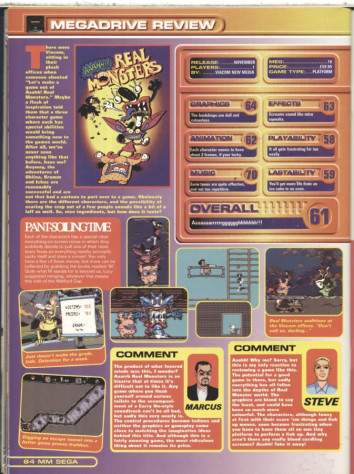 А что о ней писали в те времена? А тут у нас полный бардак и разброс оценок от 50 до 90 баллов. Короче, игровая журналистика за это время нисколько не поменялась. Самое любопытное, что лишь у издания Sega Pro есть реклама коллекционных карточек в статье с 90 бальной оценкой. Восхищались красочными задниками, интересными персонажами и уникальным графическим стилем. И игру про Бивиса и Баттхеда упомянули как ужасную. Ну это мы с вами ещё проверим. Другие же журналы были более скромны в разбрасываемых восхищениях, а Sega MegaZone упрекнула игру в том, что она платформер. Видимо уже в 95м игроки перенасытились этим жанром. Авторы Mean Machines и вовсе были недовольны что их заставили делать обзор этой игры. Столь сложная и неинтересная, по их мнению, она получилась. В целом же, все сходятся во мнениях о симпатичной графике, неплохих анимациях, забавных персонажах, но разделяются в отношении атмосферы, что была в мульте, сложности и увлекательности боёв, с платформингом.