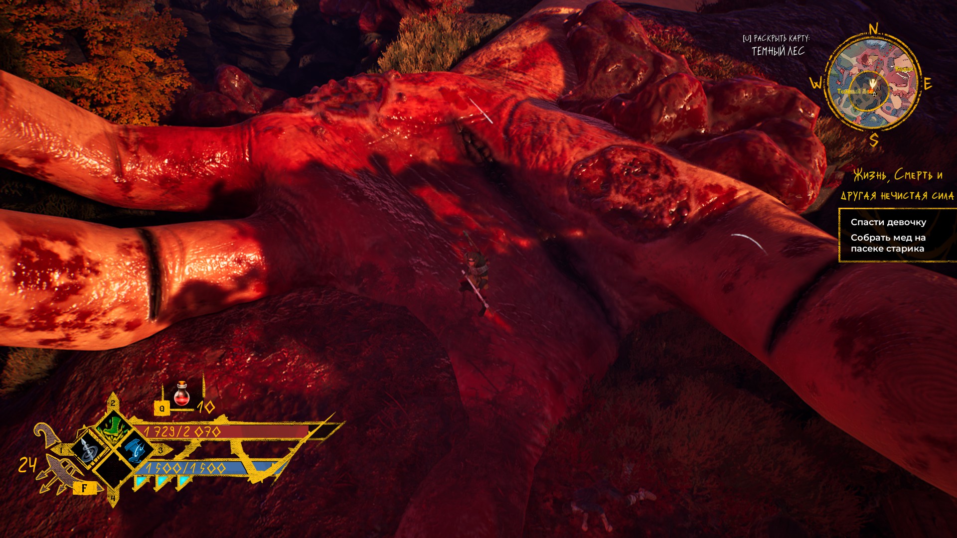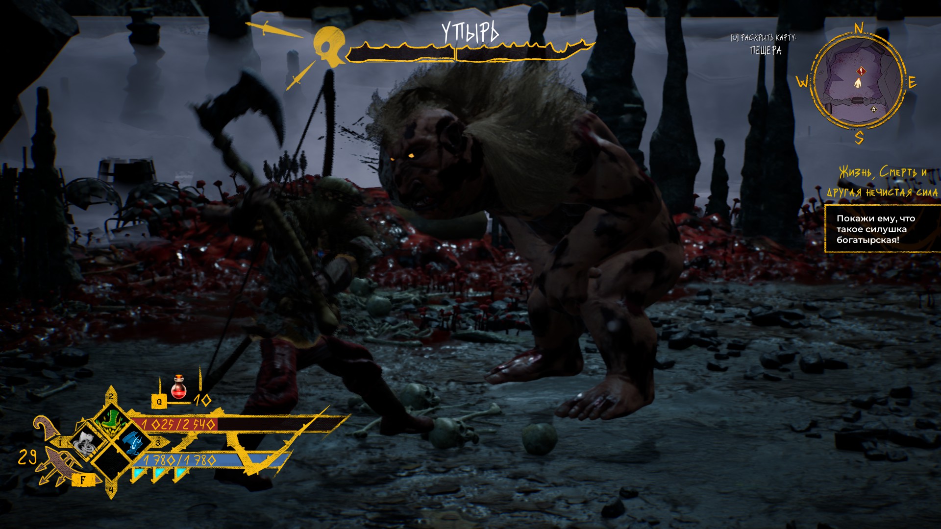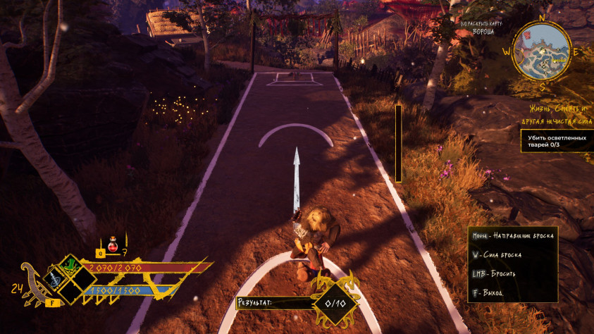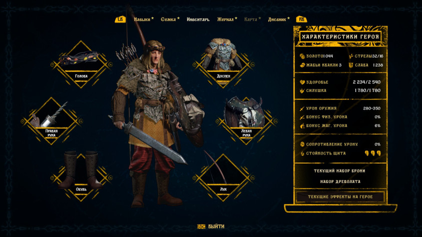 Прокачка богатыря идёт и по линии нахождения более хорошей экипировки. Имеется несколько видов оружия со своими мувсетами, лук. Вещички могут принадлежать к сетам, что даст и ещё пассивное улучшение.
