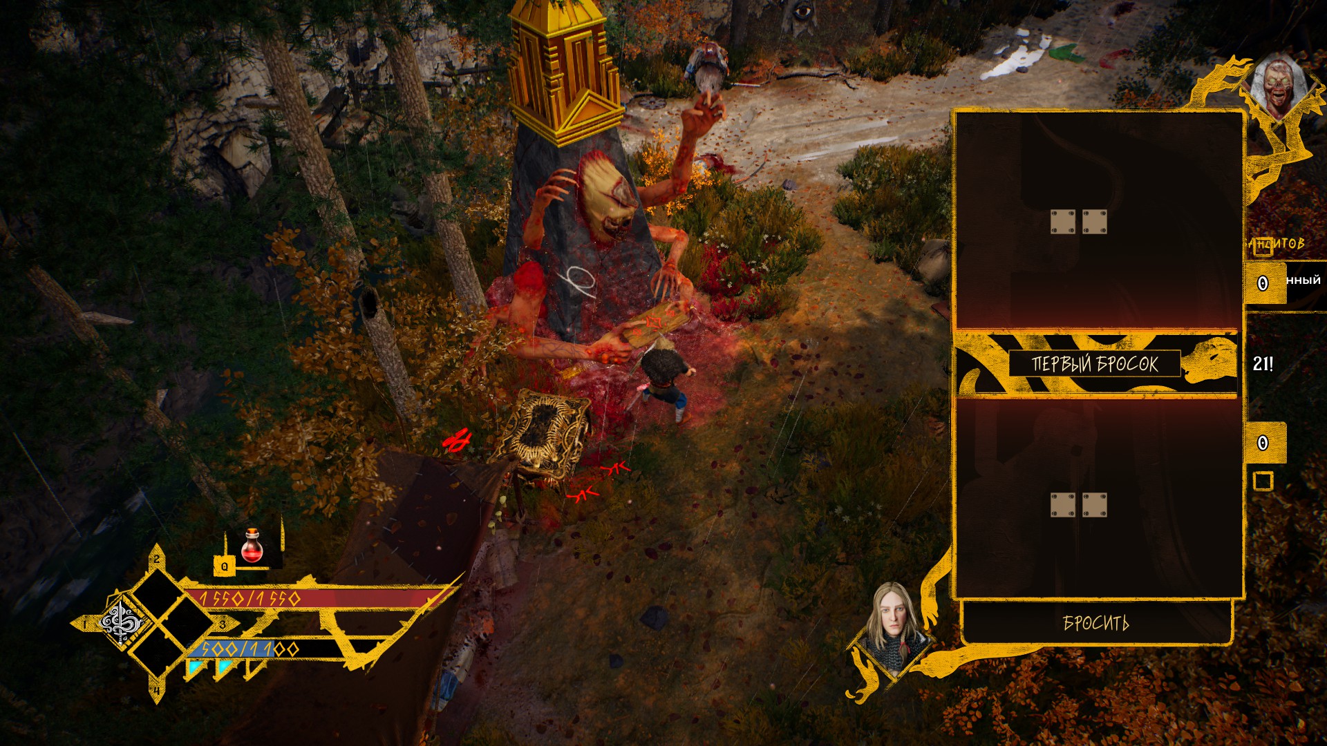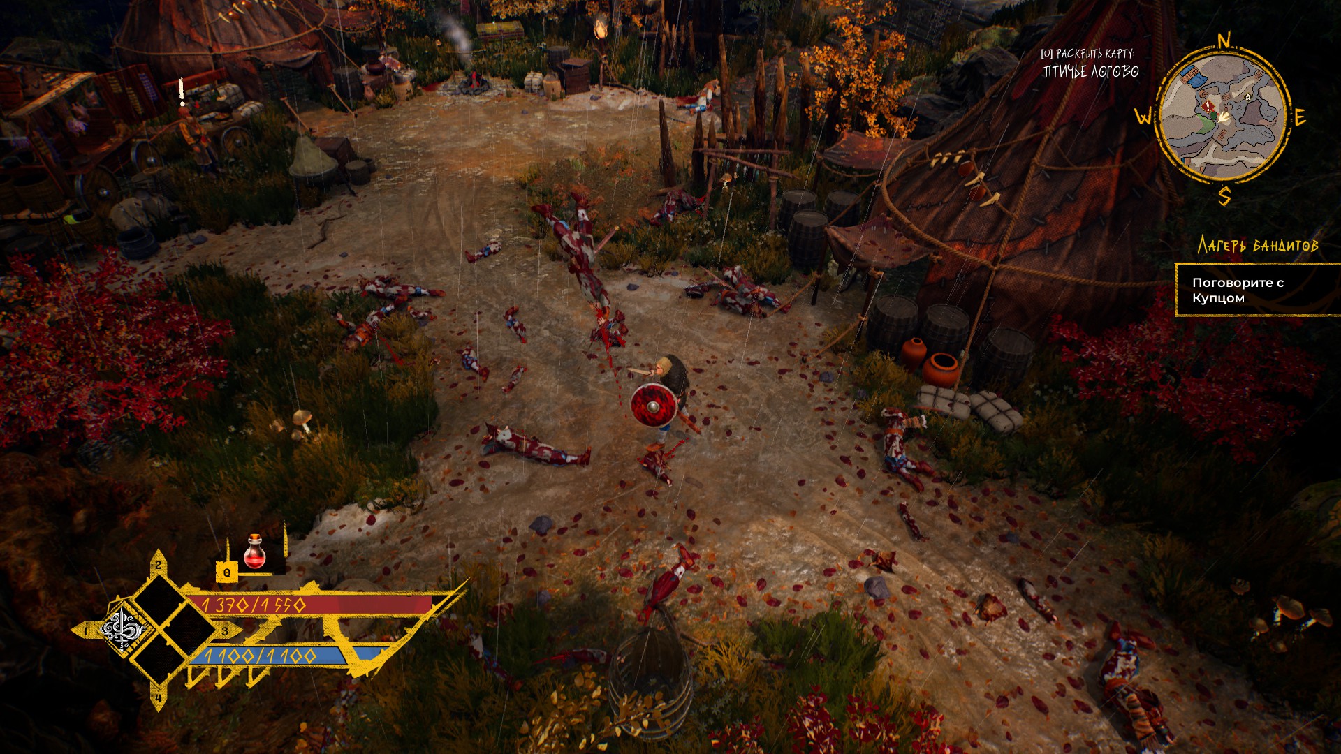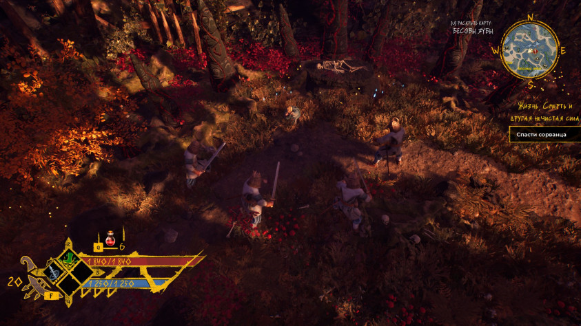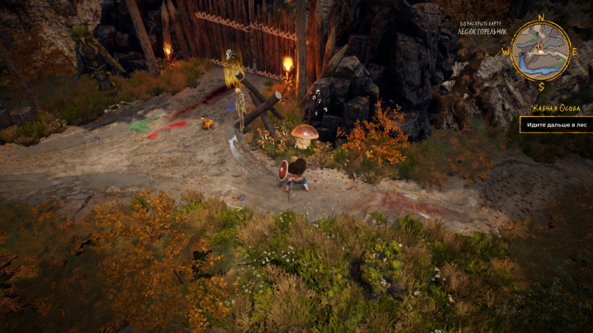 Драки происходят почти в классическом хак&слеш исполнении. Наш герой рубит простыми и мощными ударами, блокирует щитом или оружием, уклоняется кувырком. Вроде как есть контратаки — я так и не смог зафиксировать, работают ли они, уж очень быстрый темп у драк. В наличии активные скиллы и применение лечебного зелья.