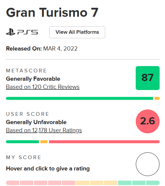 Естественно, это лишь подлило масло в огонь и люди пошли делать то, что у них лучше всего получается в таких случаях. Занижать оценки игре на Metacritic. В считанные дни GT 7 стала одной из самых низко оцененных игр в 2.5 балла.