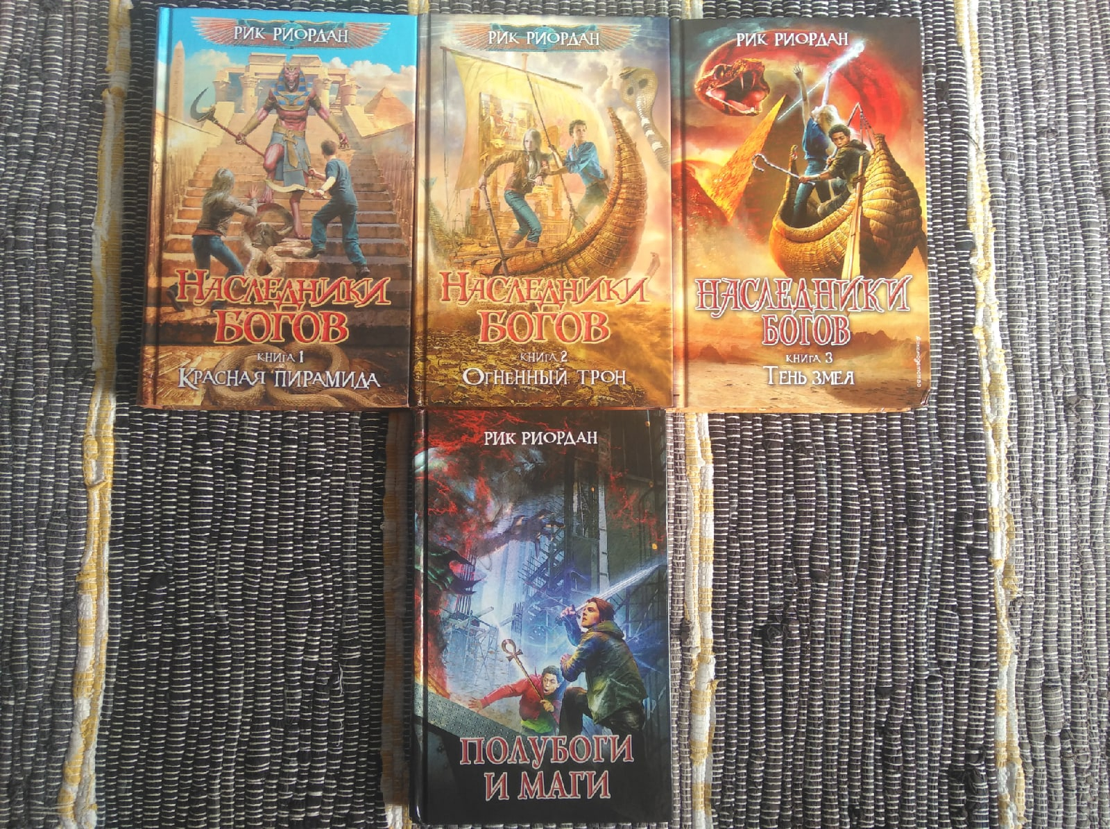 Наследники Богов. В оригинале цикл называется "Хроники Кейнов" и повествует о брате с сестрой Картер и Сейди Кейн. Книги написаны от первого лица, но повествование идёт от лица двух основных персонажей. Они являются потомками фараонов и магами, черпающими силу от египетских богов. Да-да, египетская мифология сосуществует с греческой и римской в рамках одной вселенной! Причём боги знают о существовании пантеонов друг друга, что особенно увлекательно и интересно. К сожалению этот цикл у нас подвергся какому-то расизму, потому что в первых изданиях Картера на обложках изображают белым парнем, хотя в книге чёрным по белому сказано, что он темнокожий. Благо со временем это исправили, как вы можете увидеть по обложке третьей книге и кроссовера. В основном цикле есть микро-намёки на "Перси Джексона и Олимпийцев", но книга "Полубоги и маги" это полноценный кроссовер, где Картер и Сейди сталкиваются с Перси Джексоном и его девушкой Аннабет Чейз (дочь Афины). И раз в этом мире существуют пантеоны разных мифологий, то было очевидно, о чём станет следующий сиквел.