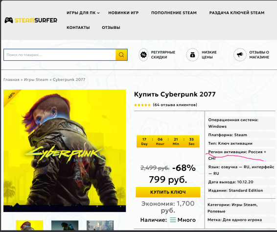 Но, к сожалению: активация в Steam, Cyberpunk 2077, в регионе РФ не возможна и, остаётся уповать на...