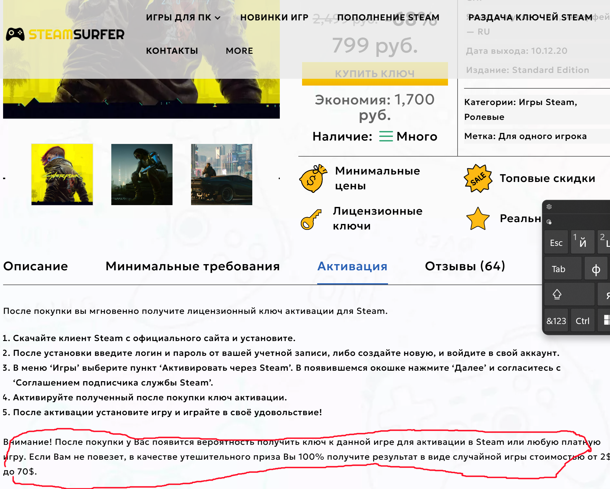 Там, в этой рекламе, в графе "Активация" - есть снизу приписка (см. скриншот ниже (что-то вроде таблеток, на которых, мелкими буквами - "не является лекарственным средством" (замануха - чтобы вместо Cyberpunk2077, всучить тебе парочку "никчёмных" игр - пусть и в токую же цену)))