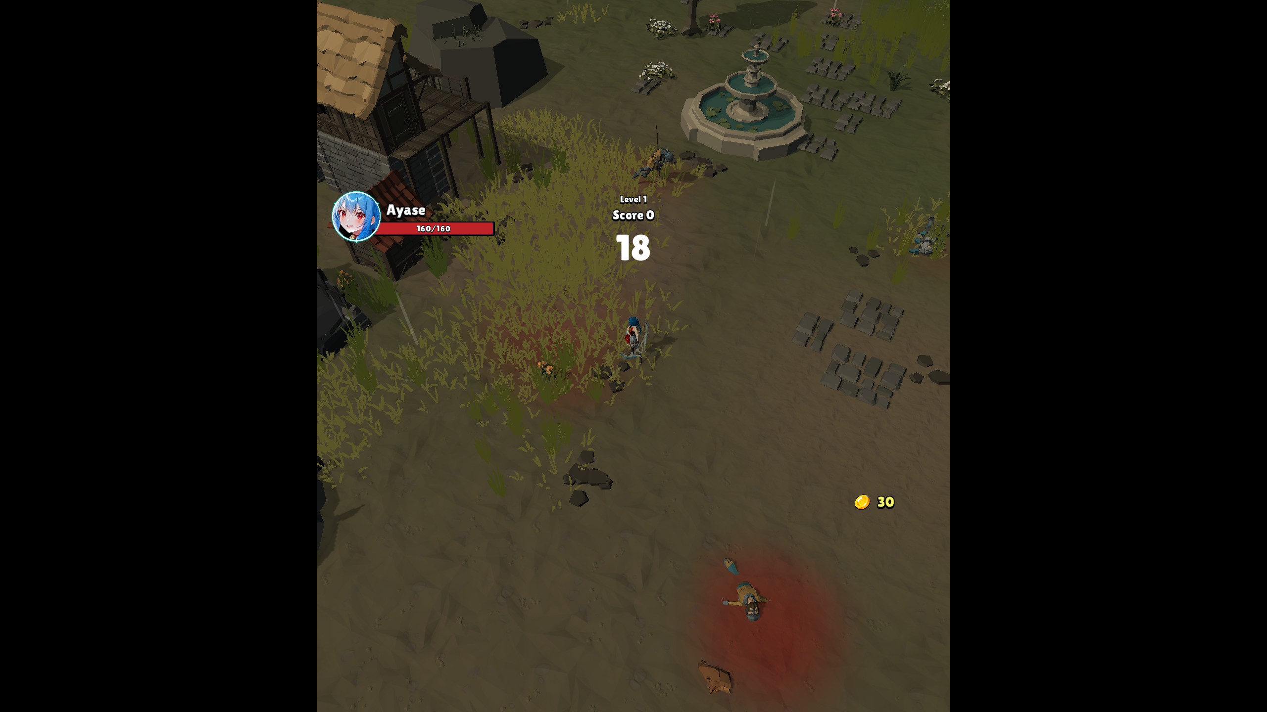 Хорошо, предположим игра такая по умолчанию и типа как ничего с этим поделать нельзя. Теоретически, если бы игровой процесс увлекал, даже с такой урезанной картинкой всё равно можно было бы играть. Однако далее идёт игровой процесс, который, как в типичной миниатюрной игре, крайне простой. Вот только простота игрового процесса не является главным, главным является интерес, который может дать даже самый простой процесс и лучшим удачным примером будет недавно вышедшая игра Shelldiver. Но что мы видим Ayase? Главная героиня появляется посреди поля боя. Тут у нас имеется некое подобие разрушенной войной деревни, в самом углу карты располагается замок с различными укреплениями, плюс, трупы солдат расположены то тут, то там и всё это в качестве границы обрамляет лес. Возникает ощущение осаждённого города, который осаждает некая вражеская армия. Вражеской армии тут, конечно нет, но есть волны монстров, которые нападают на главную героиню каждые 40 секунд. Поведение противников самое что ни на есть банальное: они просто прут толпой. Как в любой подобное игре, противники с каждой волной появляются всё более и более опасные, в то время как мы, благодаря улучшениям, становимся всё сильнее и сильнее. Классическая схема, ничего нового. Проблема только в том, что уничтожать противников тут совсем не весело, это просто не приносит кайфа. Более того, их уничтожение напоминает не некий аналог Diablo, когда противников много, но они падают с одного тычка. Нет, тут используется совсем другая тактика из-за того что противники тут довольно толстые. Тут используется тактика «пятиться назад и стрелять». Однако вскоре, несмотря на улучшения, игроку придётся не пятиться, так как это слишком просто для такой игры, а отбегать, делать пару залпов и опять отбегать. Дрочилово? Ещё какое! Я ничего не имею против гринда, но только если гринд весёлый и если он не напрягает. Здесь же он с самого начала напрягает.