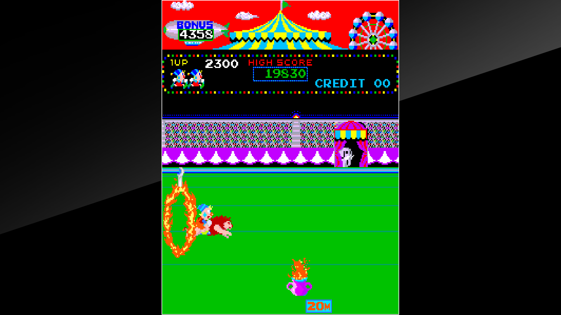 Была когда-то в одном из моих сборников своеобразная, но запоминающаяся игра под названием «Circus Charlie». Это аркада про циркового артиста, который явно не боится за свою жизнь. Насколько умело он будет вести себя «на сцене», зависит от игрока. Помнится, что доставалось пареньку сильно.