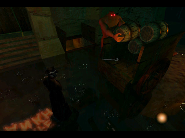 Во-первых, он невероятно тёмный. Настолько, что я сначала грешил на эмулятор. Но нет, игра реально такая. Многие объекты вообще не видно на экране. Вот, например, здесь есть дверь. Видите её? Курсор как раз на неё указывает.