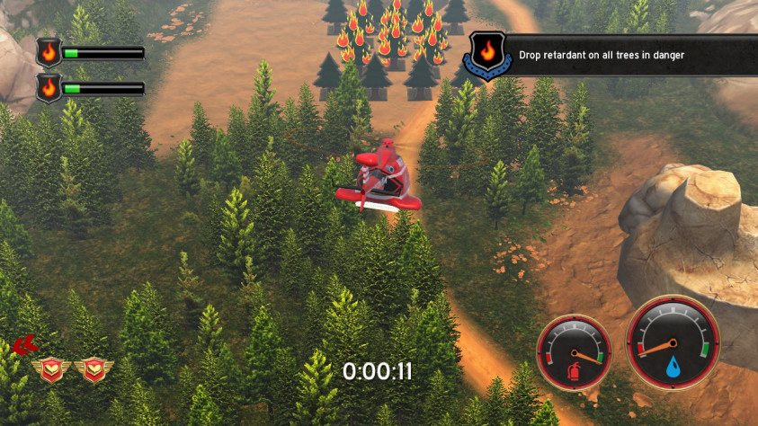 Летаешь, тушишь пожары, набираешь воду и по новой. Давишь кнопки А, В и очень много раз крутишь левый стик.