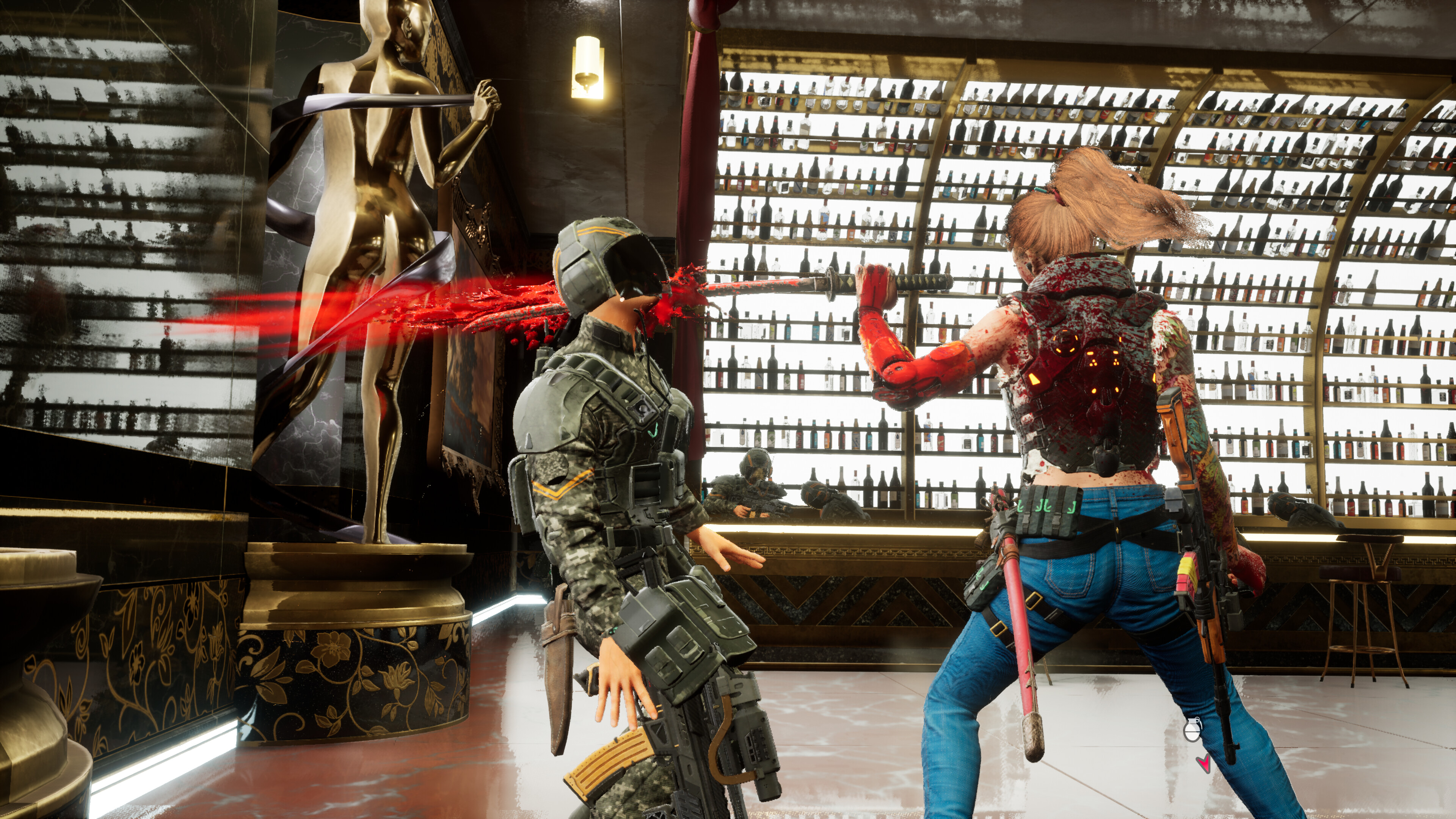 Очень обидно видеть, что про эту игру очень мало хорошего слышно в интернете, разве что недавно Вася с Ленёй обсудили её в разборе полётов и хоть что-то про неё хорошее сказали, да и в целом для многих открыли эту игру(хотя врят ли). Довольно мало слэшеров сейчас выходит. Кроме DMC, Bayonetta и astral chain мало что приходит в голову из известных и одобряемых людьми игр, поэтому даже выход такой ни на что не претендующей игры категории "Б" как wanted:dead был для меня поводом её ждать, ведь по трейлерам было видно что здесь будет расчленёнка, много экшена, комбо с катаной и огнестрел, что выглядело интрегующим. Самый главный плюс игры, ради чего и стоит в неё играть - это боёвка, она здесь очень сочная в плане рачленёнки, многих вариаций крутых добиваний и ощущения того что играешь за Джона Уика. В начале играть не так весело, пока не открыты навыки 3 веток прокачки, где и комбо расширяются и новые приёмы дают и гранаты получаешь и парирования круче и легче и становятся и вот тогда игра себя раскрывает. Уже где-то на 3 уровне в клубе, когда уже более менее раскачался можно устраивать такие Джон Уик референсы, что прям ощущаешь себя жесть каким крутым убийцей. В игре если поймать состояние потока можно просто хоть пол дня проиграть, а потом прийти в себя с осознанием того что ты прошел игру, ведь она небольшая 8-10 часов максимум. Хоть самих комбо здесь не особо много штук 5 с прокачкой, но сам мувсет обширен: есть блок и парирования, которые очень эффективны особенно на боссах, катана для ближнего боя, которой можно и руки и ноги отрубить, проводить очень разнообразные добивания, которые до конца игры вообщее не надоедают, гранаты осколочные и зажигательные, пистолет с которым также можно делать комбо в паре с катаной и самое главное им также можно парировать когда атака врага светится красным цветом, что тоже доставляет, похоже немного на бладборн и обычное огнестрельное оружие как калаш, который с тобой всегда и его можно по разному модифицировать на свой вкус и еще одно подбираемое оружие с врагов. Также на уровнях иногда разбросаны бензопилы, которые ваншотят любого врага, что приятно. Если освоить весь этот мувсет, то реально состояние потока обеспечено это выглядит и играется супер кайфово. Лично для меня один из лучших симуляторов Джона Уика в играх. Также помимо боёвки есть мини игры по типу поедания рамена, караоке и выбивания фигурок, воспоминаний и музыки из игровых автоматов, что даёт немного передохнуть от нескончаемого экшена в 5 уровнях игры. В игре классные и харизматичные персонажи, хоть они по сути особо и не раскрыты как личности, кроме главной героини, про неё хотя бы показывают аниме вставки про её тяжелое прошлое. Сам мир вроде бы интересный и бывали моменты когда тебя пытались в него погрузить, но все равно есть ощущения недосказанности и непонимания как этот мир работает, но сам сеттинг такого гонконского киберпанка очень прикольный и подходит этой игре. Многие говорят что игра вот с эпохи ps2, ps3 и это как бы плохо и устаревше, но лично мне это очень по душе, когда идешь от одной арены к другой и кайфуешь от боевки, смотришь прикольно поставленные кат сцены, наблюдаешь за харизматичными персонажами и развлекаешь себя в мини играх, не знаю в этом что-то есть вроде всё так просто, а всё равно увлекает. Очень жаль что игра провалилась и продолжения 