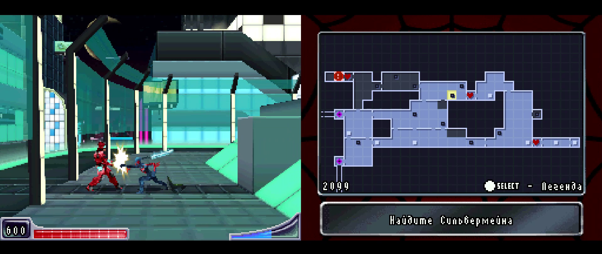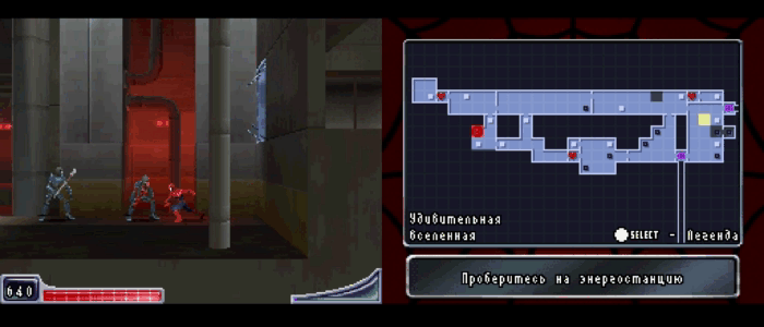Эх, тут у нас не комиксы, а игра, и она довольно средняя. Все версии имеют мало различий, за исключением некоторых особенностей. Я уже поведал о неспособности Нуара цепляться к поверхностям. Amazing вполне обычный, если играли в другие вариации портативного Паука. Тут выходит Паук 2099, который единственный способен планировать словно Бэтмен, и фишка прикольная, что отличает его от остальных. Пока этой способности не обучается Нуар, как и остальные учатся новому, и вот причина: игра устроена этакой мини-метроидванией с тремя картами для трёх Пауков, доступ к заблокированным местам, которые открываются с получением новых способностей из плит. Нет, не надейтесь, Нуар ползать так и не научится, к тому же для боссов этого не требуется. О, и тут стоит затронуть боссов.