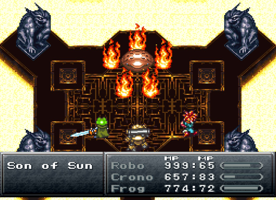 Chrono Trigger... тоже страдает, под финал, подобным, но сама по себе, боевая система здесь куда изобретательней. Для начала: в ней нет отдельных экранов битвы — все схватки происходят прямо на локациях и они все уникальны, ведь заранее продуманы. Будет несправедливо сказать, что в игре совсем нет места «случайным стычкам» — иногда, из-за края экрана, на героев всё же вылетают группы монстров, но даже такие битвы заранее поставлены.