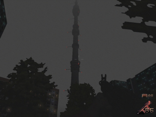 Проходим дальше куда то, уже забыл куда, и переходим на предпоследний уровень - Стройка. На стройке ничего интересного не было, просто идем с низов на вершину, где был повтор ситуации с телепортатором, до которого я снова не сразу догнал. Хотя вру, был один момент который дал понять, на каком уровне разрабы крутые. Короче, в игре вообще есть прыжок, и толку от него по большому счету ноль, но тут были окна наружу. И меня как то инстиктивно потянуло на то чтоб попробовать выпрыгнуть из окна, что я попал на зону мгновенной смерти персонажа. Но выглядело это странно, я долетал до какой то серой зоны и в момент касания умирал. Так вот стоило мне перед падением с края поребрика прыгнуть в сторону, как я оказался на просторах серой безжизненной местной Москвы. Все прям как в гугл картах видел, везде маленькие хрущи с огоньками, парижская эйфелева теле-башня, здание мгу, ну короче воссоздали красиво.