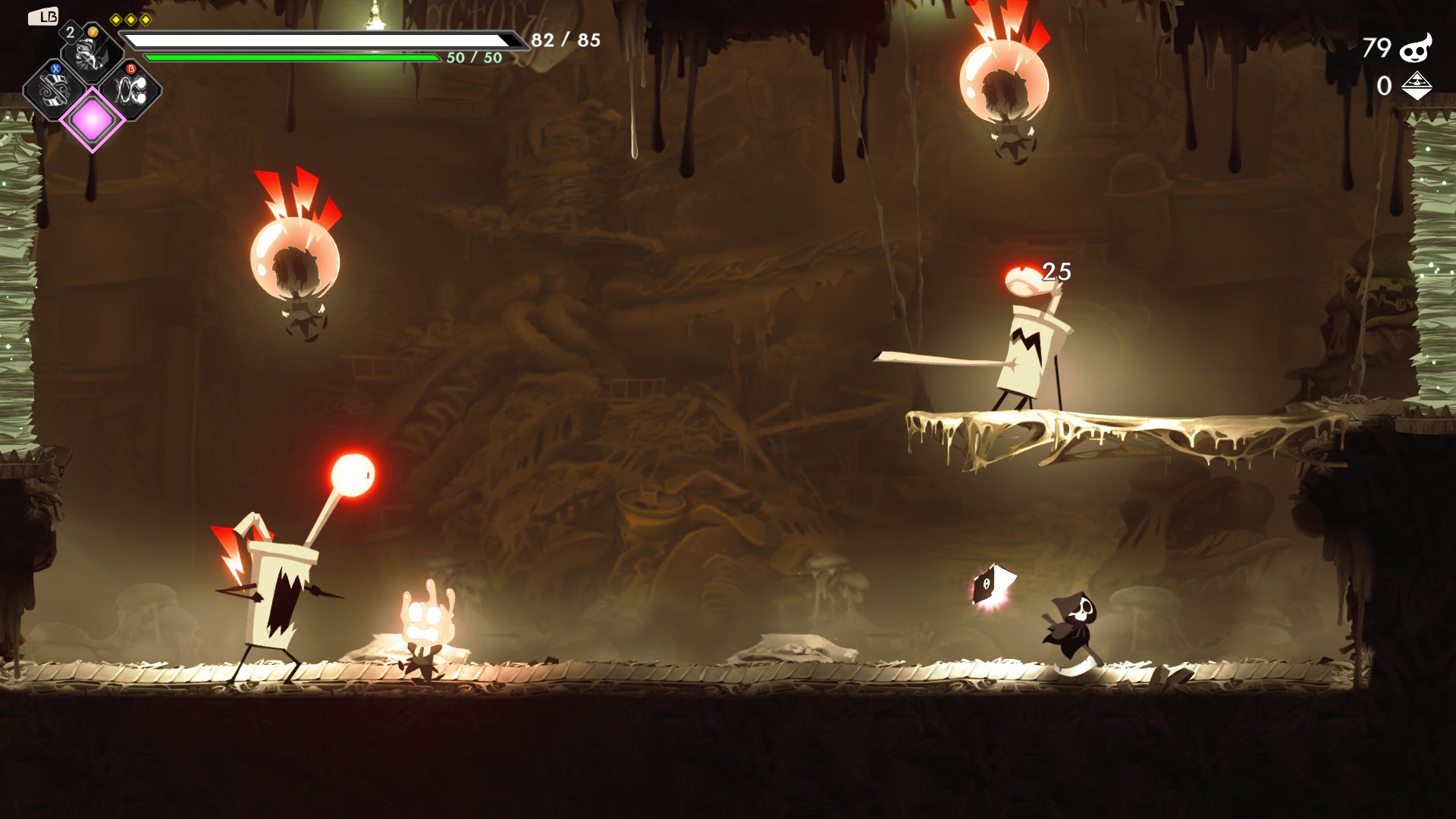 Анимация и дизайн противников замечательно сделаны: создания из жижи пузырятся и текут, стаканчики с колой подражают самураям. Движутся сочно. Однако они не соответствуют геймплейным требованиям. Анимация в видеоиграх сделана так, чтобы доносить информацию до игрока: противник готовится к замаху, замахивается, наносит удар. Все игры так делают, даже самые быстрые образцы по типу Smash Bros. Have a Nice Death пропускает замах оставляя только позу подготовки к нему. Выходят мгновенные удары и поголовно нечестный урон. Форму удара невозможно предугадать: мелкий чертик в коробке вытягивается в четыре собственных длины и достанет сквозь пол второго этажа арены. Предупреждение с тонким «!» над головой плохо читается в боевом хаосе. Хорошая техника для энергичной анимации в телешоу не подходит для игры