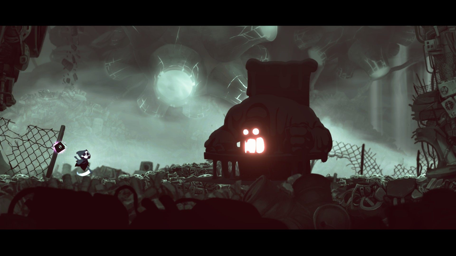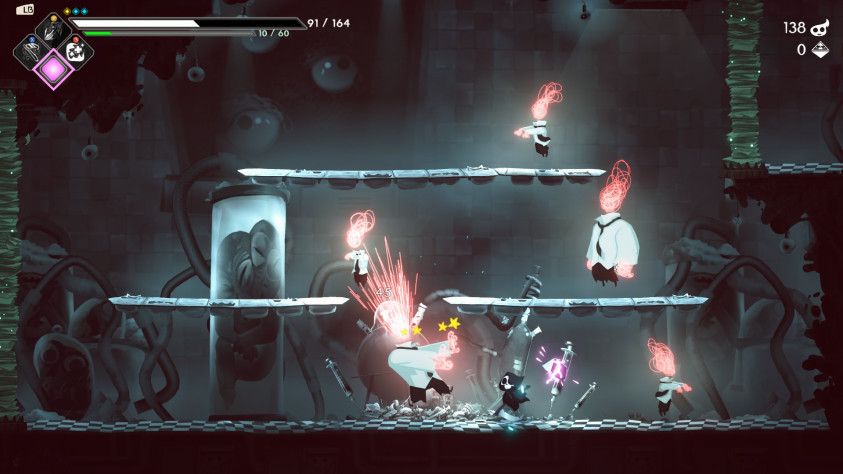 Арт-стиль игры был главной причиной покупки. Я не остался разочарован, хотя радости было меньше ожидаемого. Маленький Смерть миленько летает, тыква-интерн чарует существованием. Этажи захламлены кучами ассоциированных вещей: отделение зависимости задавлено иголками и шприцами, отделение переедания залито кипящим сыром. Враги сделаны из черной массы или одеты в офисный дресс-код. На корпорацию хорошо ложится музыка словно из криповой сказки, где рассказывают о добрых путешествиях злых духов. Цветовая палитра придерживается мрачных тонов и чуть ли не монохромного стиля. Это вкусно, но со временем приедается. Игра так крепко держится одного стиля, что он начинает душить. Будет сложно провести 100+ часов в серой игре. Перепрохождение забегов вредно этому стилю