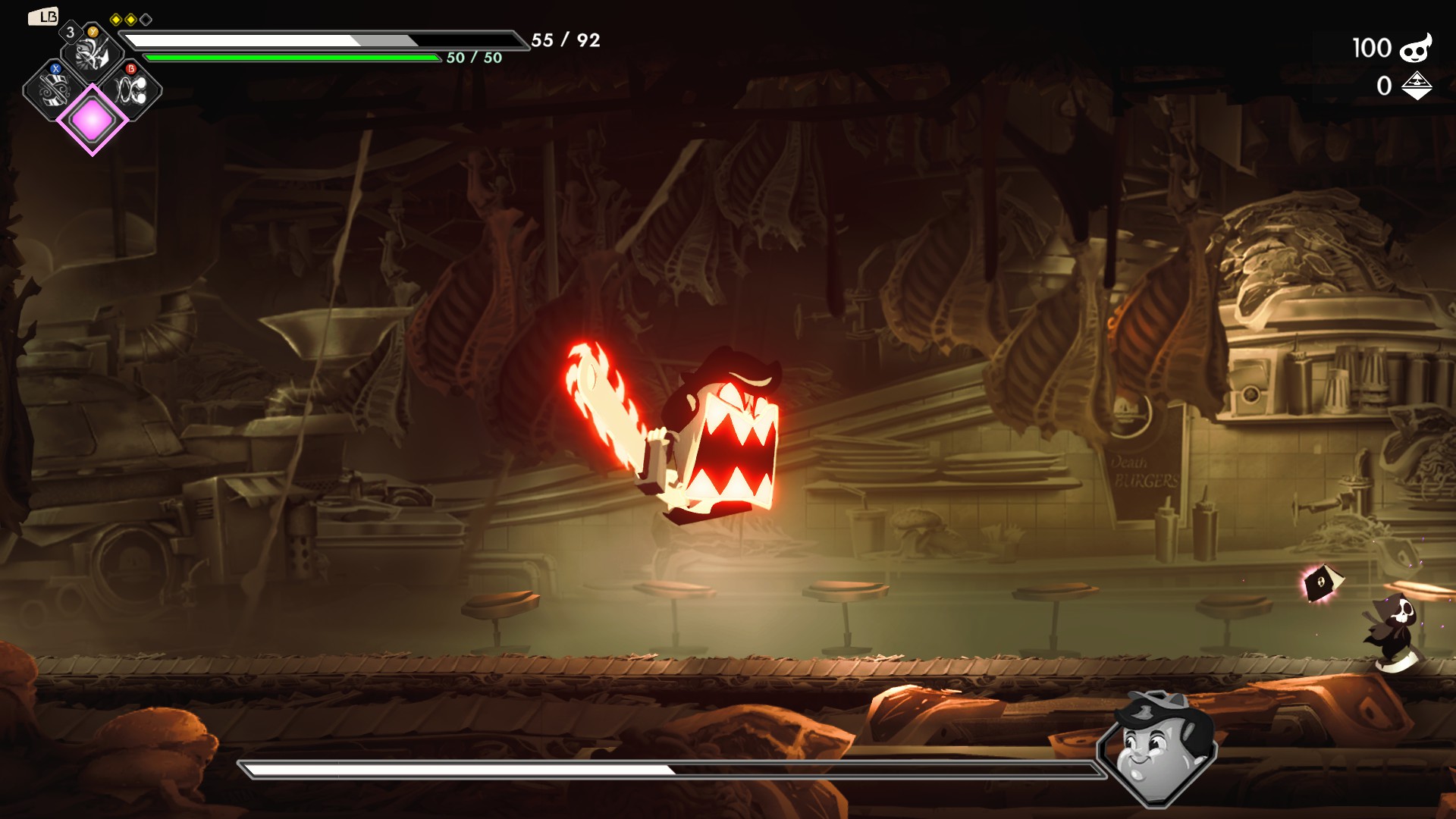 Особенно это противно на боссах-Горечах, которые охватывают всю комнату уроном в мгновение ока. В частности, глава отделения переедания Валдо стреляет толстым лазером из газировки, на которую почти невозможно среагировать. А его замахи бензопилой растягиваются на пол-арены и достают за спиной. Реакция на опасную позу должна быть безупречной, значит игроку надо осторожно ходить по арене и пятиться от всякого движения босса. Мувсет можно заучить, но он не становится от этого приятным. Некоторые атаки похожи на буллет хелл, и летучим персонажем было противно протискиваться в небольшие зазоры (по крайней мере мне). Наложите поверх этого большой урон и получите отвратительных боссов. Они должны быть украшением жанра, но здесь их свели до главной фрустрации