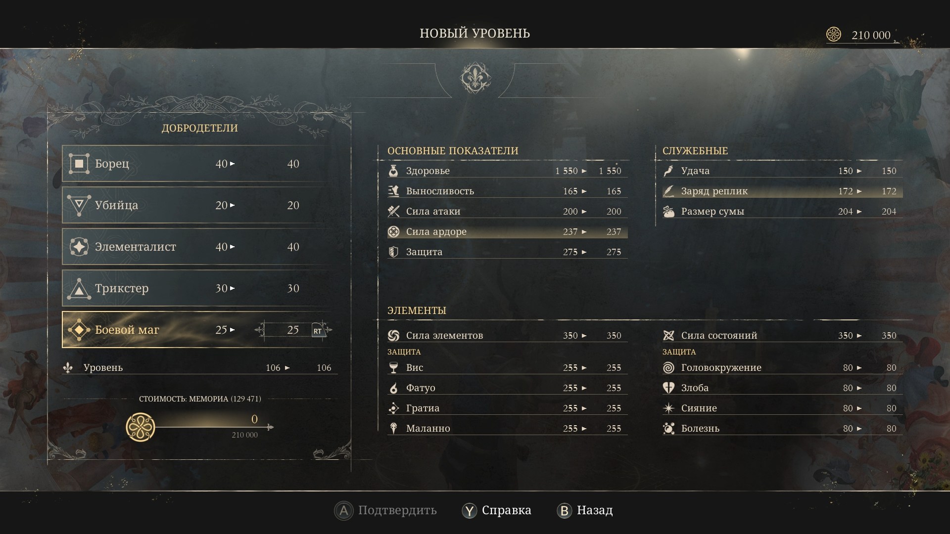 Я вообще прибег к практике Nioh, прокачал все характеристики до 20, подкинул в здоровье и выносливость по десятке, дальше сфокусировался на основной характеристике и всю игру не знал никаких проблем.
