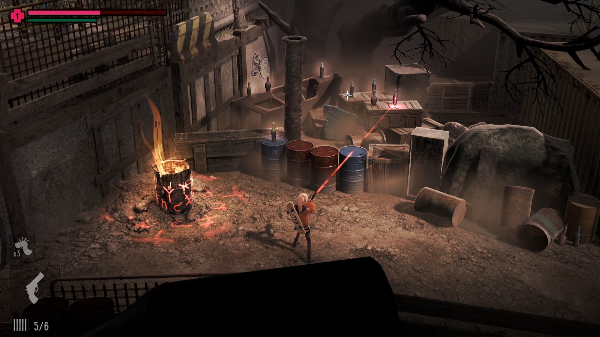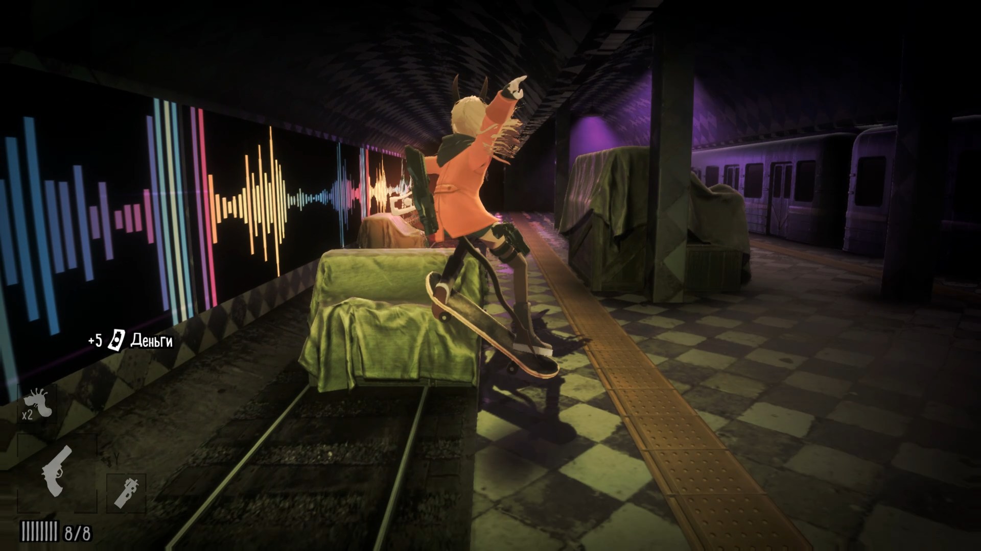 Так же с врагов выпадают маски, за них мы открываем различные проходы, скинчики для скейтборда и детали лора, накиданные в небольшом меж-пространственном киоске-хабе. Во время сражений играет довольно бодрячковая музыка, если бы ещё дроп патронов и хилок был организован на манер Resident Evil 4, то было бы вообще прекрасно. На харде это даже стало небольшой проблемой, финал я проходил фактически без ничего вообще, а тактику против последнего босса пришлось гуглить, поскольку механика его убийства оказалась не очевидной и думать в четыре утра, чего такого я не делал всю игру, что от меня теперь требуется, мне не хотелось. В остальном бои это буквально Hotline Miami, разве что у тебя и врагов есть хп, плюс перед боем можно скормить особому пню личинку-гранату, чтобы убить случайного врага. Действие довольно бессмысленное, так как одной гранатой легко взорвать сразу пачку супостатов.
