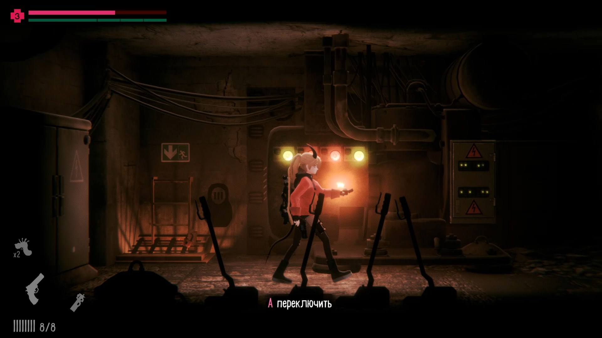 В нашем распоряжении находится скейтборд (к слову о SH, да) для ближнего боя, дьявольвер, гранаты и три вида дополнительного оружия: дробовик, автомат и коломёт. Дьявольвер постепенно прокачивается, чисто технически патроны у него бесконечные, так как перезаряжается он около специальных бочек, либо при выпадении патронов из убитых врагов. При этом, во время боя бочки частенько не активны и не редко ты оказываешься вообще без патронов. Доска, конечно, проблемы решает, но из-за странных хитбоксов и зачастую плохо читаемых ответных атак врагов (по началу они подсвечиваются восклицательным знаком, ближе к концу придётся играть на предикте) получить леща проще простого. За полную зачистку комнаты мы зарабатываем деньги, тратить их придётся исключительно на хилки и иногда патроны.