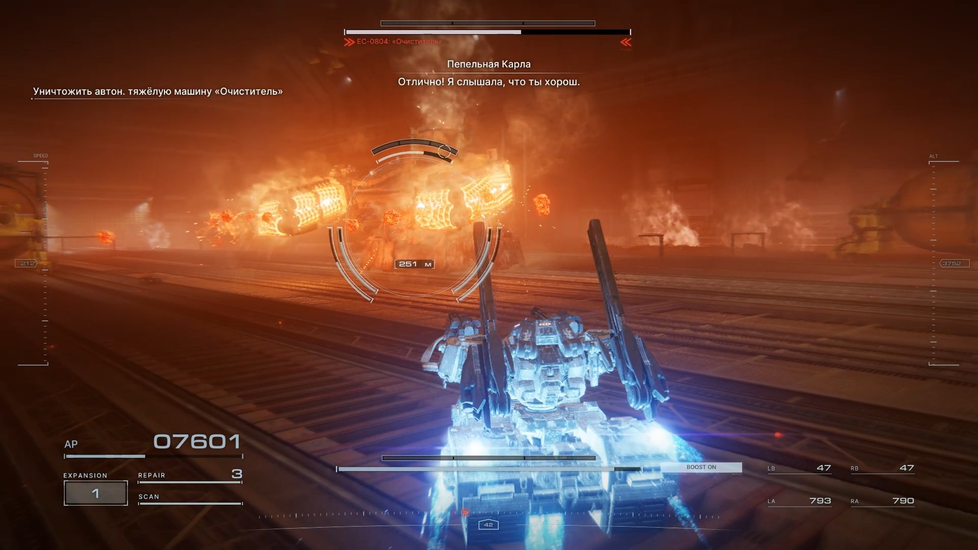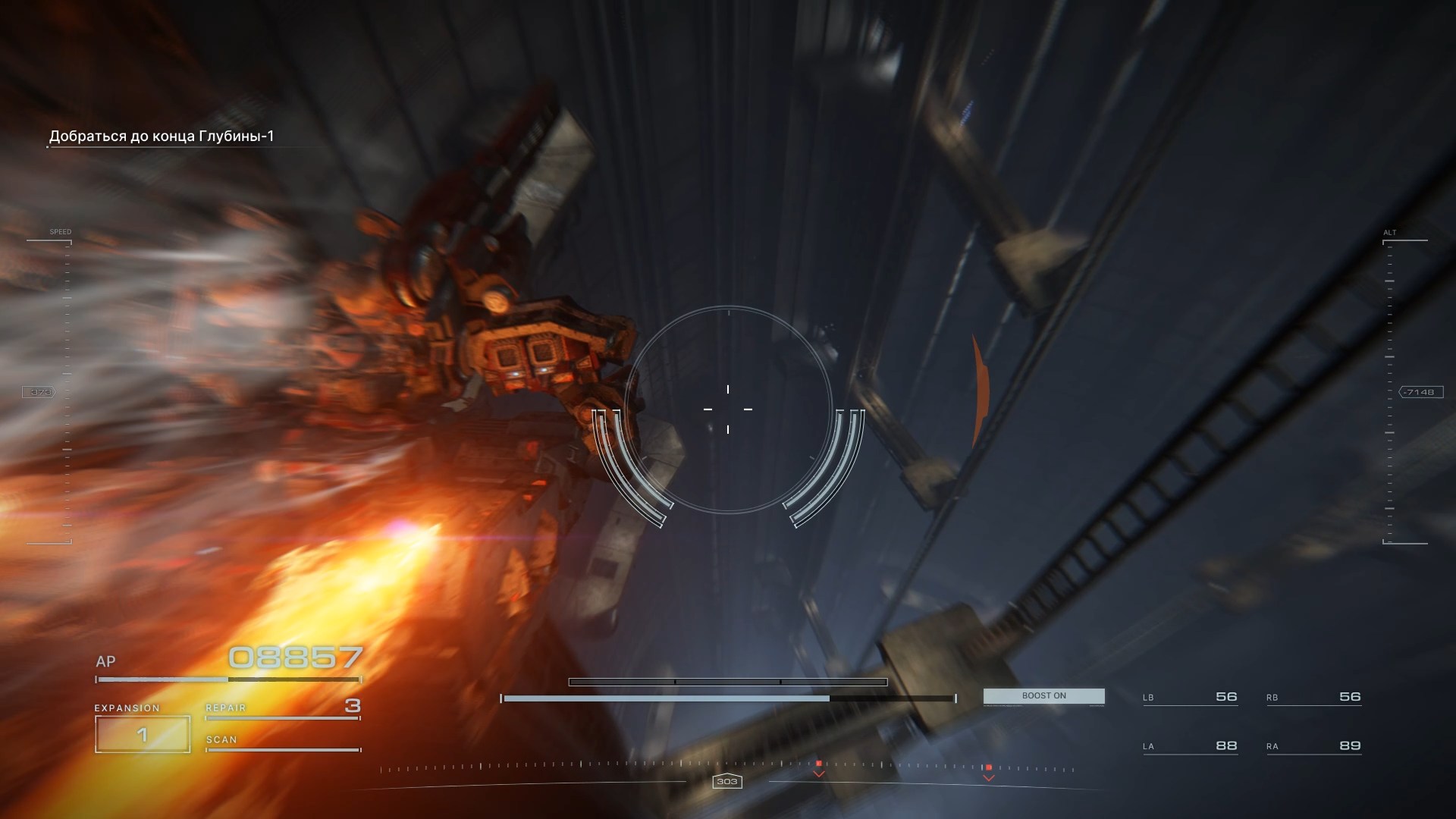 Возможно, если бы баланс энергетических винтовок оставался, как в старых играх, то ситуация не была бы такой плачевной. Не знаю, когда в серии было принято решение добавить к плазме боезапас, но это натурально развязывает руки. Теперь твой тяжеленный боевой робот, спокойно может уходить от вражеских атак, шмаляя из всех четырёх стволов разом. Так как в игре довольно много энергетических барьеров, плазма и лазеры становятся настоящей имбой, пробивающей любую защиту, до кучи быстро перегревая системы противников (аналог концентрации из Sekiro), оставляя их беззащитными и позволяя за одно-два точных попадания разобраться с абсолютно любым врагом.