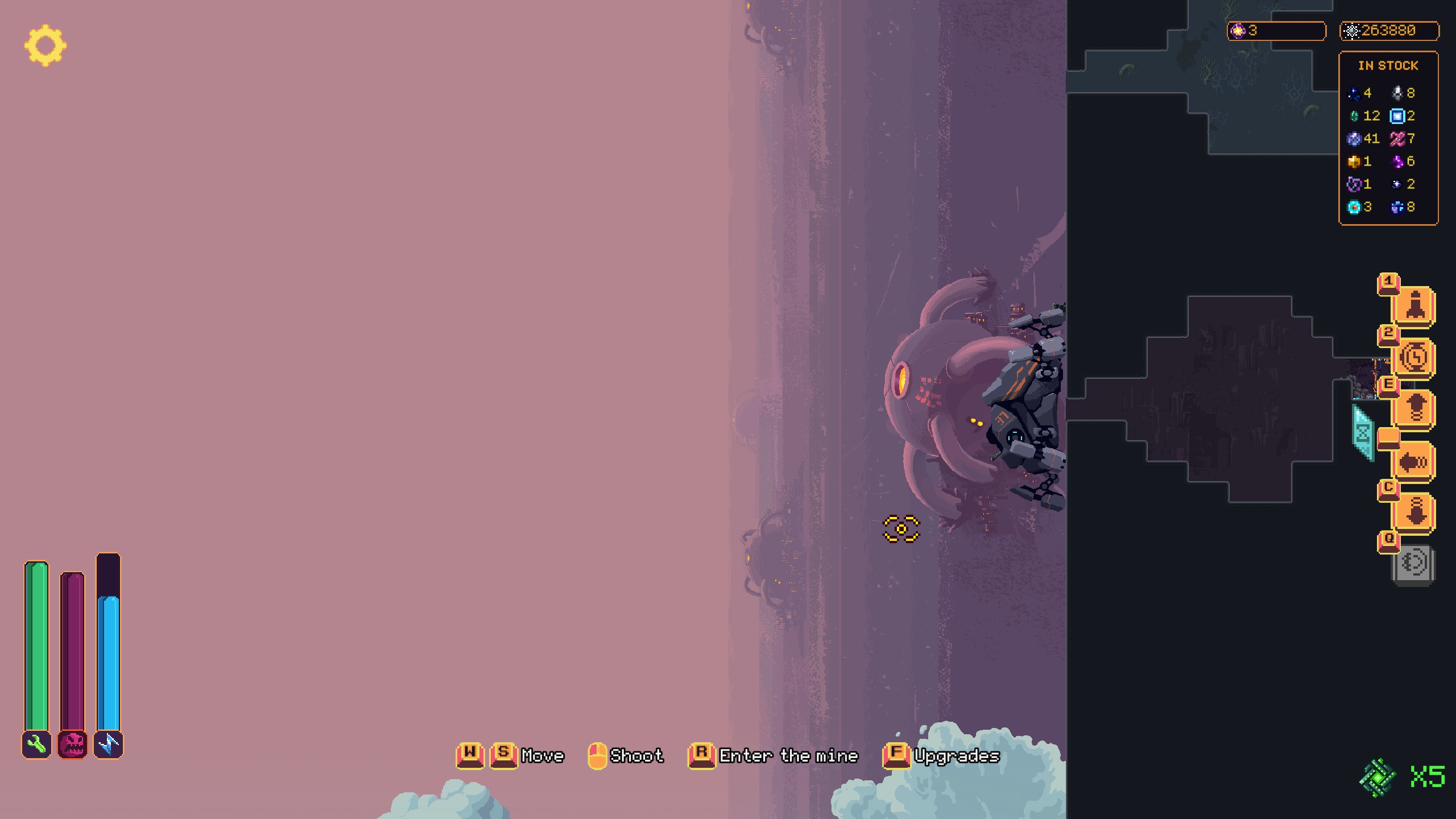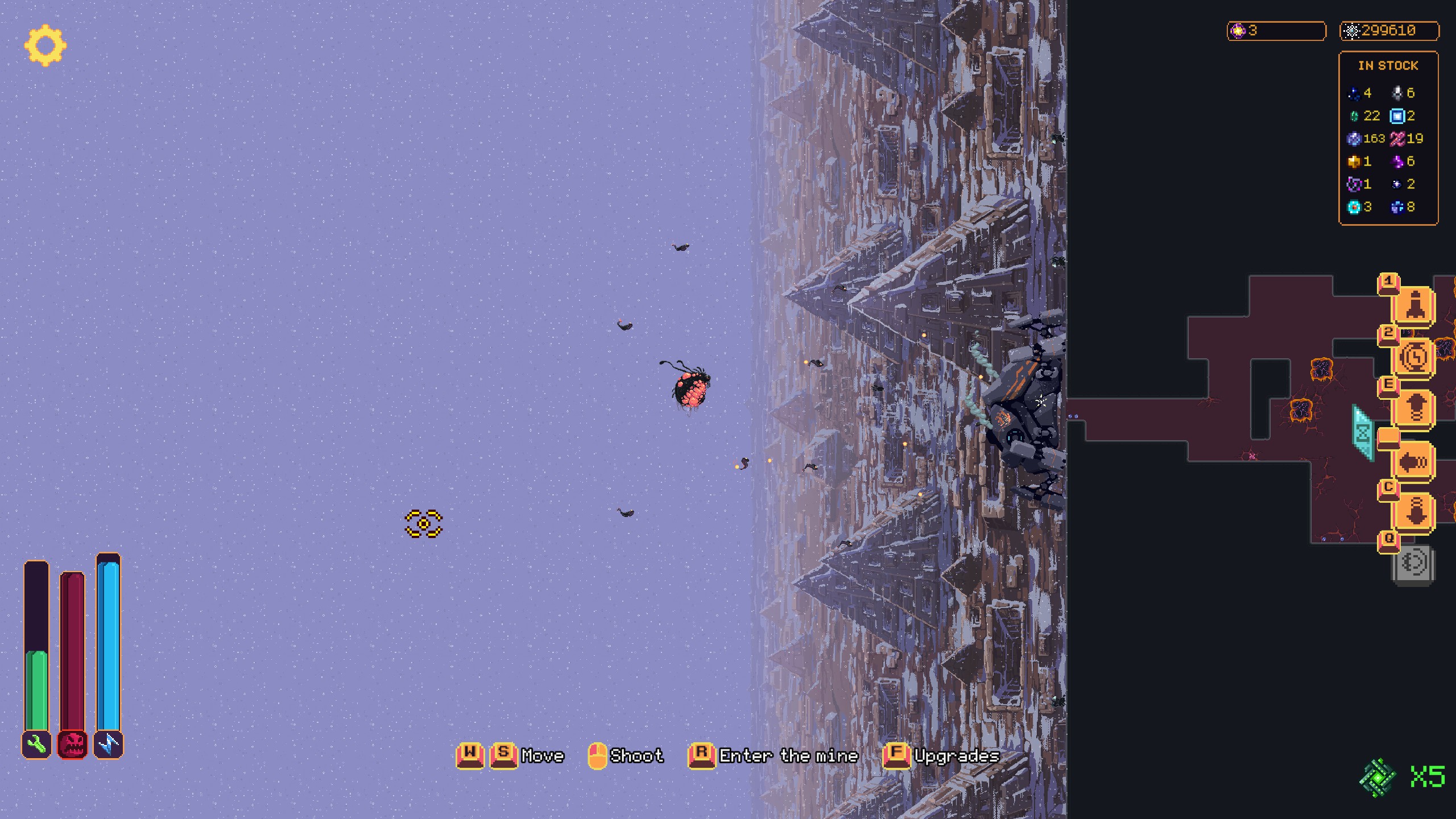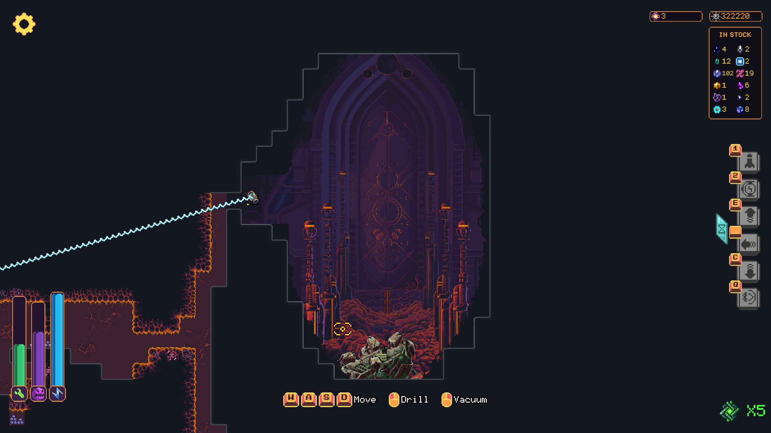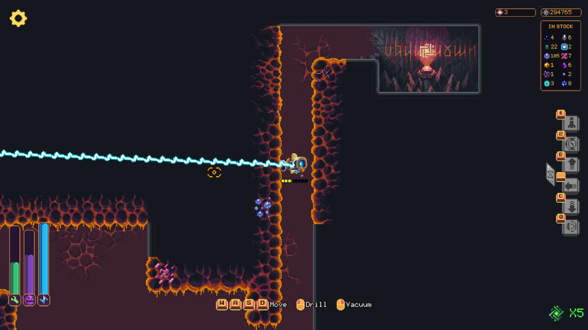 5 ключей к ядру как цель всей игры. Они находятся так же как чертежи к постоянным улучшениям (почти всегда располагаются в самом конце пещеры, преимущественно в верхнем углу). Так что в любом случаи мы снова и снова бурим пещеру не для того чтобы собрать кристаллы и улучшить наш бур и нашего паука, а исключительно чтобы найти чертёж, а так же один из 5 ключей необходимых для запуска ядра. Всё это может отбить желание у игрока, но мне доставляло наслаждение бурить. Поэтому чувства монотонности игры я не испытал. По факту, это должна была быть миниатюрная игра на 3-4 часа, но…