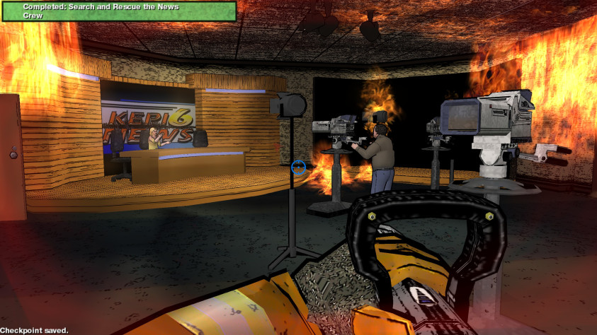 Начнём с того главного что игрок будет делать в этой игре – тушения пожара. По видеокадрам из игры мы видим, как выглядит пожар. А теперь просто прибавим к этому, что у нас не огнемёт, а строго обратное «оружие», но функция этого оружия в точности такая же, как у любого огнемёта в FPS боевике. Отличие же в том, что в этой игре струю воды мы направляем на разные поверхности (пол, стены, столы, компьютеры и пр.), которые объяты огнём. В случаи стен, что объяты огнём, мы можем получить что-то типа ожога, и зачастую гражданские не могут продвинуться далее, пока мы не потушим стену объятую огнём, но если не приближаться близко к такой стене, можно пройти мимо неё без ущерба для здоровья. Это важно отметить, так как зачастую тушить пожар в каждом случаи просто невозможно – огонь будет появляться снова и снова. А вот если пол объят огнём, то тут придётся тушить огонь просто по причине невозможности пройти дальше. В итоге, игрок создаёт как бы туннельный маршрут, коридор в этом огненном пространстве либо чтобы пройти из точки «А» в точку «Б» либо чтобы вывести гражданских из огненной ловушки. Хорошо это или плохо, сказать трудно, но нужно иметь в виду, что главным в игре является не тушение пожара, а выполнения заданий. Да и зачастую потушить пожар либо очень трудно, либо невозможно. Поэтому эта игра не про то, что тут якобы такой вот медитативный геймплей в котором нужно просто тушить огонь, какой только увидишь. Нет, в этой игре мы выполняем задания, которые вовсе могут касаться не тушение пожара, а, к примеру, спасения собачек или детей или не допустить, что бы огонь уничтожил картины или деревянную постройку. Но это же интересно, разве нет? Для начала 2000-ых, это действительно выглядело интересно, но для 2026 года, увы, нет.