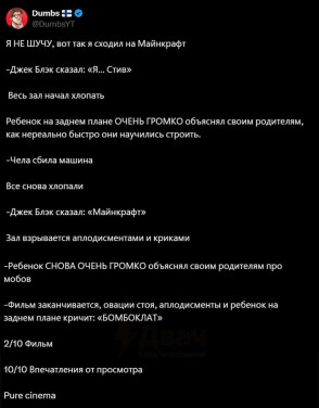 Кратко про фильм. Хотя я думал, что основная аудитория Майна — уже дяденьки за 20+/30 лет, которые росли на нём во время пика летсплеев и всяких грифер-шоу (а это, на минуточку, было 10-12 лет назад), а детишки сейчас больше по роблоксу и фортнайту фанатеют.