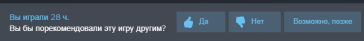 Там если нажимаешь Да, то нужно писать обзор, а я не хочу писать обзор на свою же игру, тем более пока другие этого сделать в стиме не могут)) это как само… лайкосом заниматься)) ну ты понял)