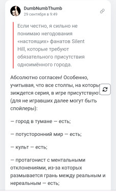 Решил всë же сейчас пойти на NG+. Только начал, а уже появились новые места, ранее запертые, и обновлëнные страницы дневника. Как минимум ради полноты понимания истории пройду ещë пару раз, да и геймплей меня, как многих недовольных, не особо напрягает, у меня в основном вопросы к балансу, то всë довольно просто, и действуя неспеша, легко выхожу победителем из схватки, то закидывают жирным и быстрым мясом, а сражения явно рассчитаны на дуэли. В целом, игрой доволен, не новое слово в жанре survival horror, но как типичная Восточная хоррор-игра (т.е. кривоватая, непривычная, немного неудобная, но увлекательная, всë как мы любим со времëн появления хорроров на PS1-PS2) она неплоха. Безумным фанатом Silent Hill не являюсь, я больше по Resident Evil, так что к отсутствию того самого города отношусь спокойно.