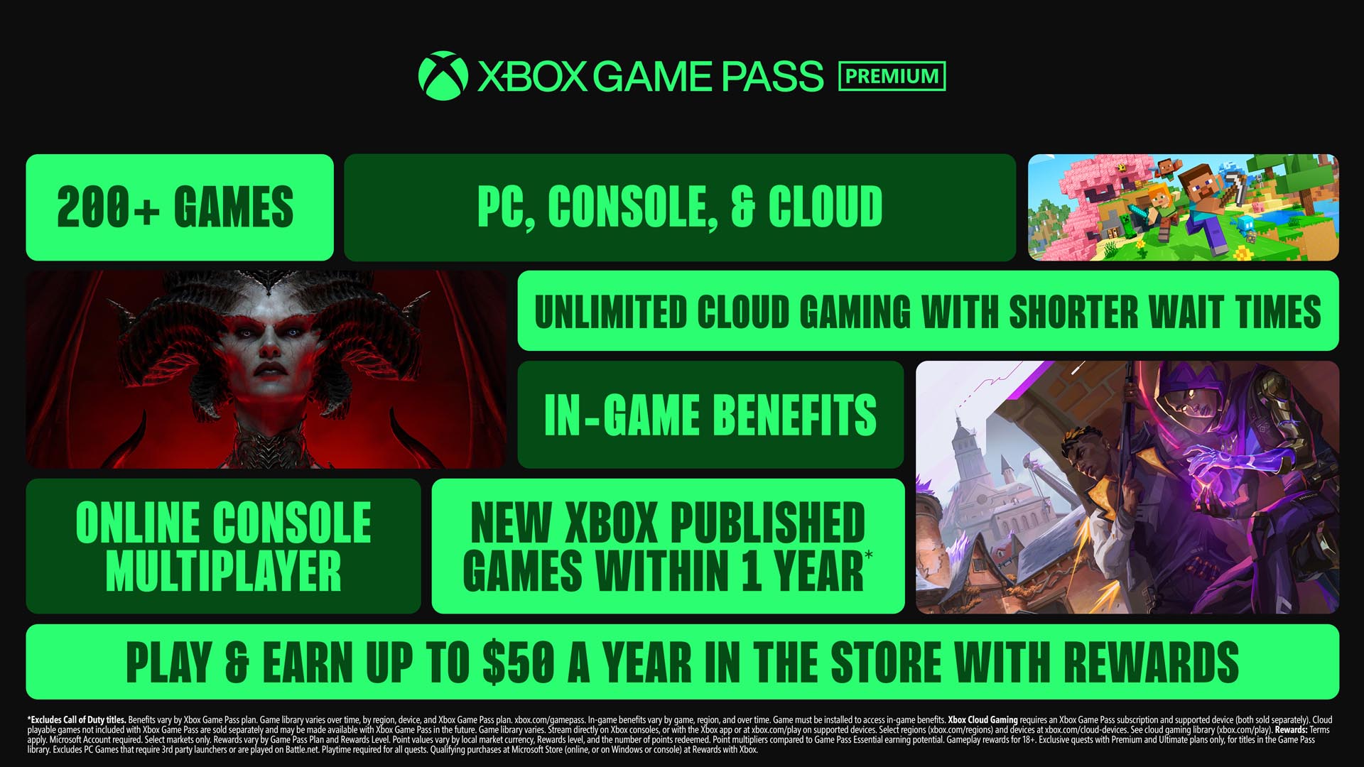 Тариф Premium за $14,99 предлагает доступ к 200+ играм на ПК, консолях и в облаке. Сегодня туда добавили Diablo IV и Hogwarts Legacy. В будущем в Premium будут попадать проекты Xbox в течение года после релиза, за исключением Call of Duty.