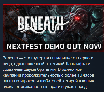 По словам разработчиков, Beneath — это признание в любви старой школе хорроров и шутеров. Здесь важно не только метко стрелять, но и уметь сохранять хладнокровие при взгляде в бездну — ведь она смотрит в ответ.