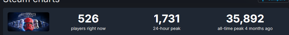 а ради кого вы «развиваете» свою великолепную трешку? У не менее многострадального star wars: battlefront II, онлайн в суточном пике в 3 с небольшим раза больше, чем у этого… У этого. А бф2 на минуту, уже как 4 года официально мертв с точки зрения поддержки. (если путаю дату, то поправьте)