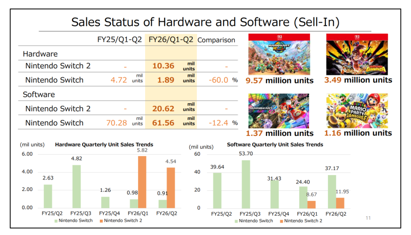 - Общий тираж Switch 2 по итогам двух кварталов достиг 10,36 миллиона устройств. Это больше, чем за такой же период смогли достичь первая Switch (4,7 миллиона устройств), PlayStation 4 (7,5 миллиона устройств) и PlayStation 5 (7,8 миллиона устройств).