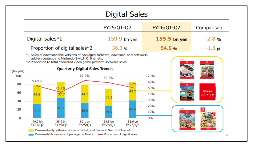 - Доля продаж игр в «цифре» составила 54,5 % — это на 1,8 процентных пункта меньше, чем годом ранее, а также ниже на 4,8 процентных пункта по сравнению с предыдущим кварталом.