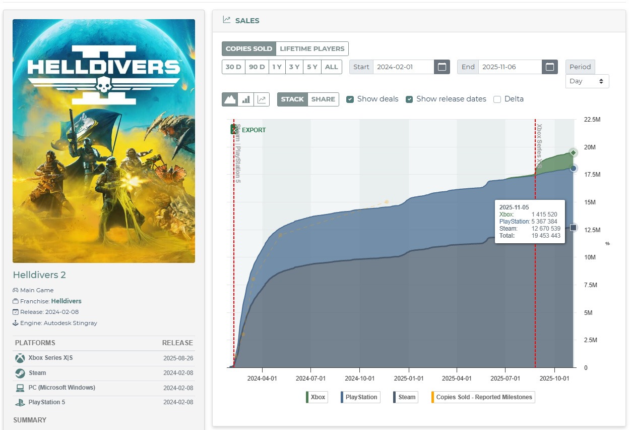 Помимо аналитики ARC Raiders, Эллиотт походя поделился и оценочными продажами Helldivers 2. По данным Alinea Analytics, игра про огромных жуков, холодных мехов и демократию почти достигла отметки в 20 миллионов проданных копий: 12,7 миллионов из них продано в Steam (65 % аудитории), 5,4 миллиона на PlayStation 5 и 1,4 миллиона на Xbox Series.