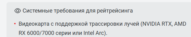 - Видеокарта с поддержкой трассировки лучей (NVIDIA RTX, AMD RX 6000/7000 серии или Intel Arc).