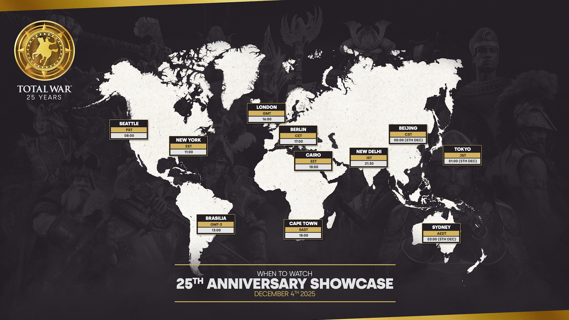 Сотрудники Creative Assembly во всю готовятся к празднованию 25-летия Total War. В честь этого события они ещё летом анонсировали юбилейную презентацию. Сейчас же в преддверии мероприятия разработчики объявили точное время запуска трансляции — 4 декабря, 19:00 МСК.